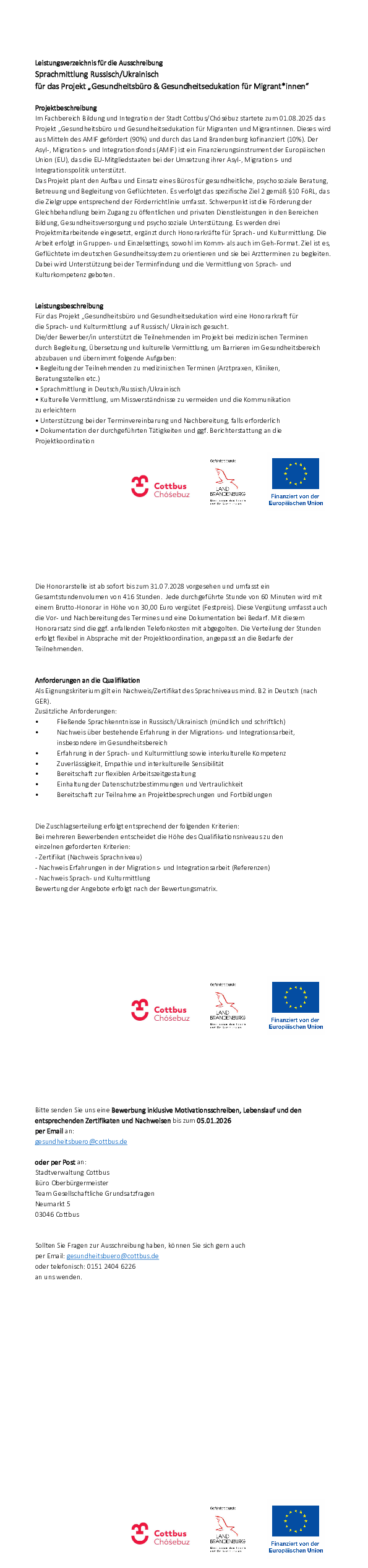 Im Fachbereich Bildung und Integration der Stadt Cottbus/Chósébuz startete zum 01.08.2025 das Projekt „Gesundheitsbüro und Gesundheitsedukation für Migranten und Migrantinnen. Dieses wird aus Mitteln des AMIF gefördert (90%) und durch das Land Brandenburg kofinanziert (10%). Der Asyl-, Migrations- und Integrationsfonds (AMIF) ist ein Finanzierungsinstrument der Europäischen Union (EU), das die EU-Mitgliedstaaten bei der Umsetzung ihrer Asyl-, Migrations- und Integrationspolitik unterstützt.