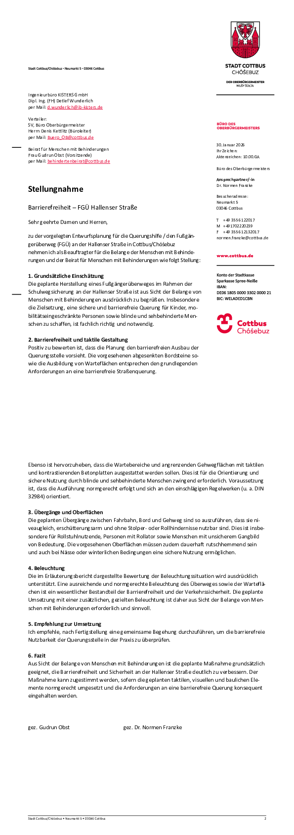 In einer aktuellen Stellungnahme zur geplanten Querungshilfe an der Hallenser Straße begrüßen der Beauftragte für die Belange von Menschen mit Behinderungen sowie der Beirat für Menschen mit Behinderungen die vorgesehenen Maßnahmen zur Schulwegsicherung und Barrierefreiheit.