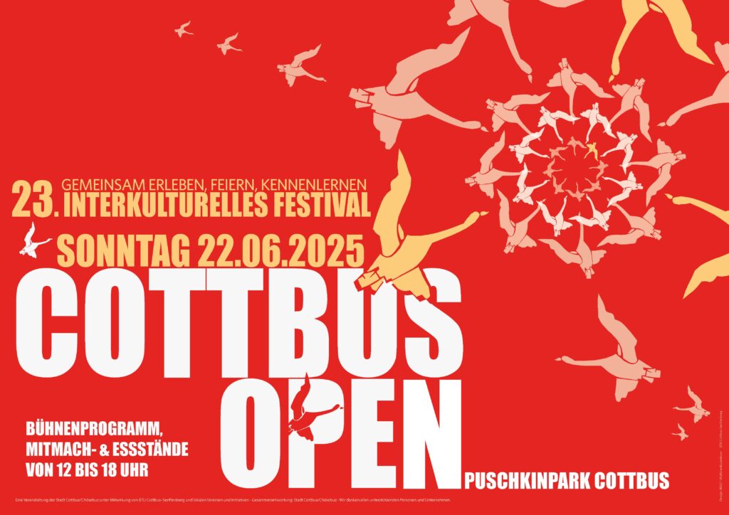„COTTBUS OPEN“ steht sinnbildlich für unsere Einladung an die Welt, unsere Stadt kennenzulernen, hier heimisch zu werden, zu lernen, zu forschen, zu arbeiten, aber auch das Leben zu genießen, Freude zu haben und Freunde fürs Leben zu finden. Ein idealer Anlass ist unser interkulturelles Festival „COTTBUS OPEN“ am 22. Juni 2025 im Rahmen des 32. Cottbuser Stadtfestes. Weltoffenheit fördern, Mut machen, Vorurteile überwinden, andere Kulturen verstehen – das sind Anliegen, die uns allen am Herzen liegen. Zusammen mit der BTU und einer Vielzahl von Institutionen, Trägern und regionalen Unterstützern, unterbreiten wir allen Bürgerinnen und Bürgern sowie Gästen unserer Stadt ein Angebot zum Kennenlernen, Begegnen und Erleben. Neben einem bunten Bühnenprogramm locken auch kulinarische Highlights aus ver-schiedenen Ländern die Besuchenden weit über die Stadtgrenzen hinaus an. „COTTBUS OPEN“ steht für Vielfalt und Diversity, vollkommen unabhängig der ethnischen Herkunft, der Religion oder Weltanschauung.