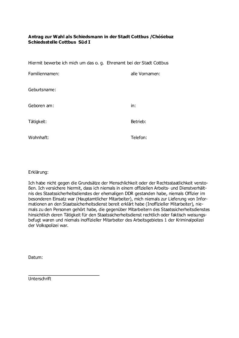 Bewerbungen werden bei der Stadtverwaltung Cottbus/Chóśebuz, Rechtsamt, Neumarkt 5, 03046 Cottbus entgegengenommen.