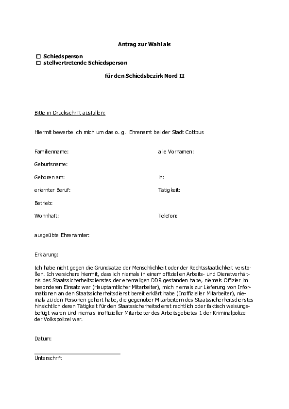 Wer sich bewerben möchte, muss wahlberechtigt sein, das 25. Lebensjahr vollendet haben und in dem Schiedsbereich wohnen. Das Ehrenamt ist befristet für 5 Jahre. Bewerbungen werden bei der Stadtverwaltung Cottbus/ Chóśebuz, Rechtsamt, Neumarkt 5, 03046 Cottbus entgegengenommen.