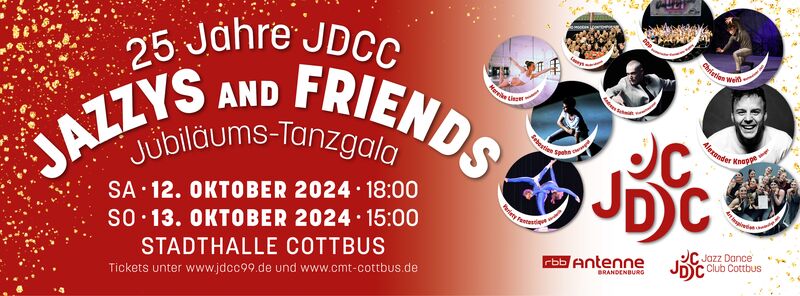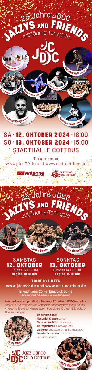 Anlässlich des 25-jährigen Bestehens veranstaltet der JDCC 99 e.V. am 12. und 13. Oktober 2024 in der Cottbuser Stadthalle eine große Jubiläums-Tanzgala unter dem Titel „Jazzys & Friends“. Mit rund 140 tanzenden Mitgliedern und zahlreichen lokalen Künstlern und Künstlerinnen verwandeln alle Beteiligten die Stadthalle in eine spektakuläre Tanzbühne, auf der das Beste aus 25 Jahren Vereinsgeschichte präsentiert wird. Weltmeisterliche Performances, einzigartige Choreografien und überraschende Gastauftritte von Künstlern wie Alexander Knappe und dem Femella Tanzstudio machen diesen Abend zu einem unvergesslichen Erlebnis. Die Tanzgala bietet den Vereinsmitgliedern nicht nur die Möglichkeit, ihre neuen Choreografien vorzustellen, sondern fördert auch den Austausch mit anderen Tanzsportarten und sichert das hohe Leistungsniveau unserer Turnierformationen.