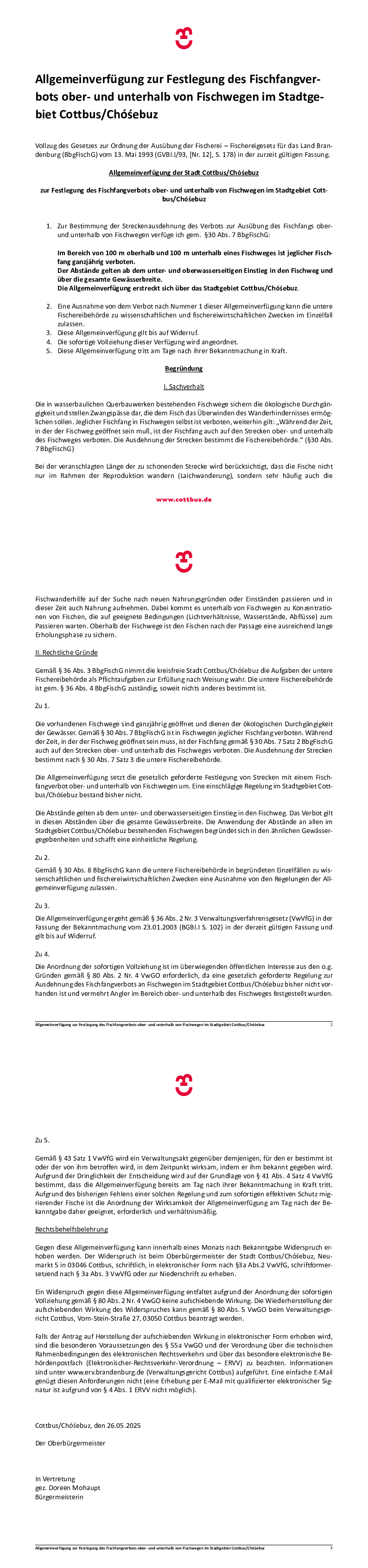 Allgemeinverfügung zur Festlegung des Fischfangverbots ober- und unterhalb von Fischwegen im Stadtgebiet Cottbus/Chóśebuz - Stadt Cottbus/Chóśebuz