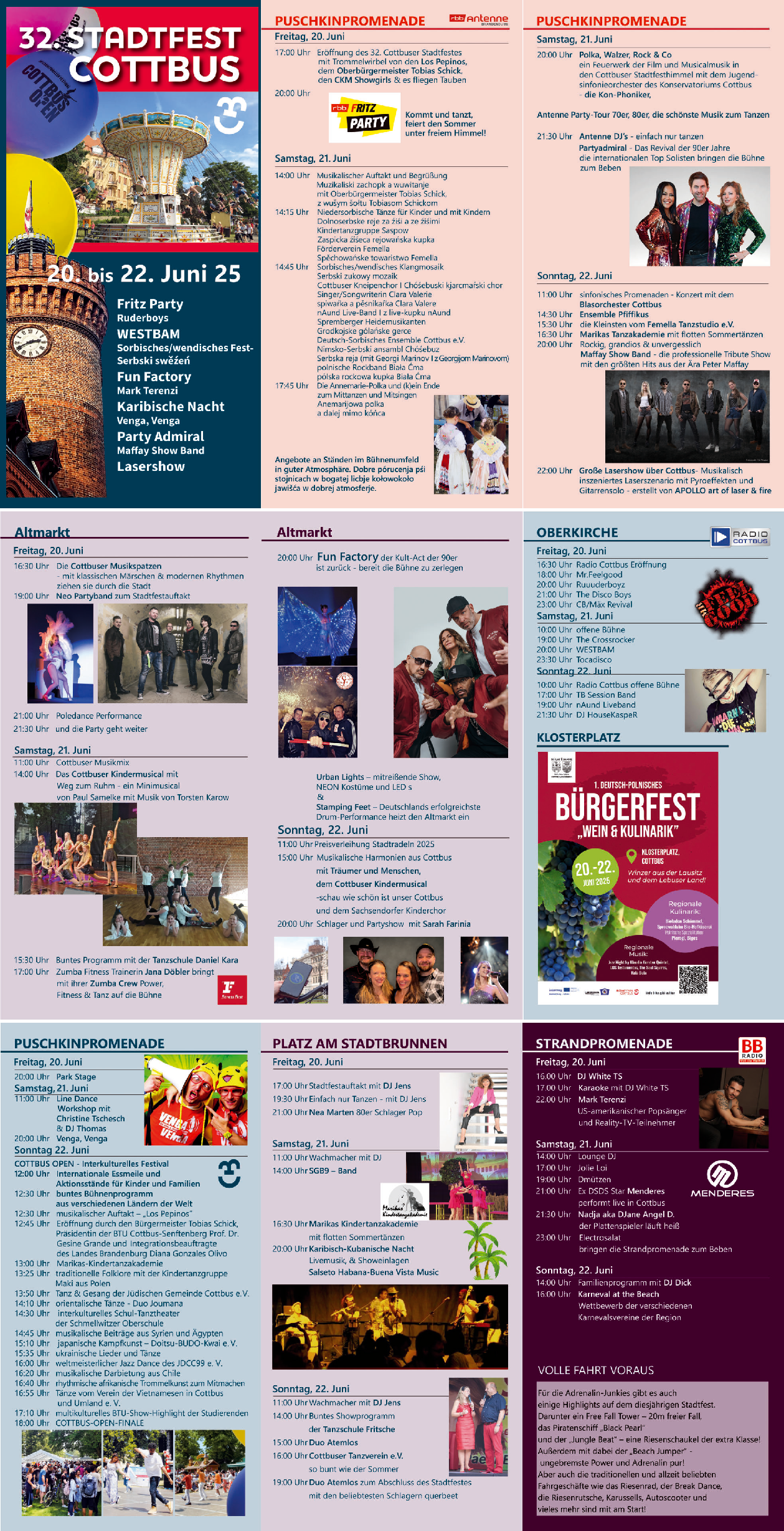 Vom 20. – 22. Juni startet das Cottbuser Stadtfest und lockt wieder tausende Besucher in die Innenstadt. Zum 32. Mal werden sich auf dem Areal um den Altmarkt, den Stadthallenvorplatz, der Spremberger Straße, den Platz am Stadtbrunnen, den Park an der Puschkinpromenade, den Postparkplatz und die Oberkirche kulturelle Höhepunkte, kulinarische Angebote, Fahrgeschäfte und Verkaufsstände zu einem bunten, dreitägigen Programm vereinen.