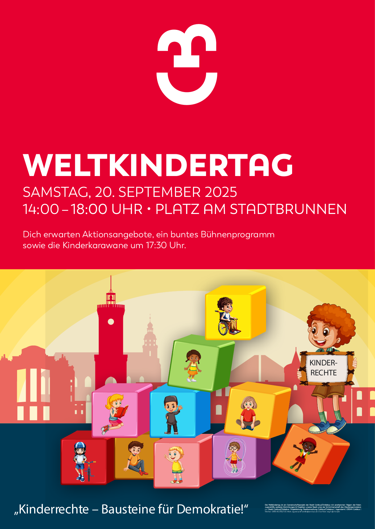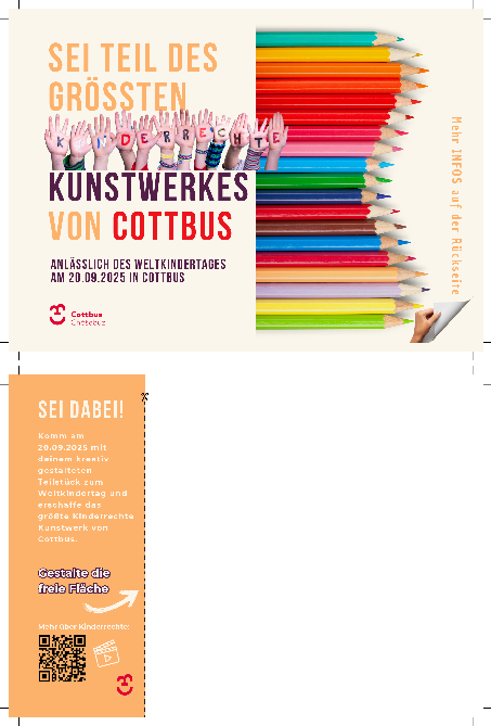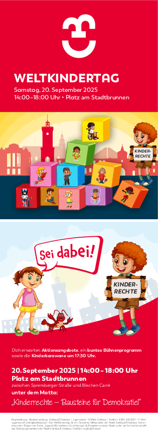 Am Samstag, 20.09.2025, wird von 14:00 bis 18:00 Uhr der 33. Weltkindertag auch in Cottbus/Chóśebuz, auf dem Platz am Stadtbrunnen, gefeiert. Unter dem Motto „Kinderrechte in der Welt“ setzen sich 14 verschiedene interaktive Projekte mit dem Thema Kinderrechte auseinander. Mitmachen ist ausdrücklich erwünscht.