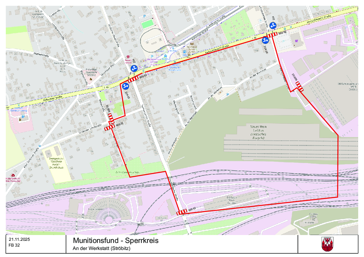 Nach dem Fund einer Weltkriegsbombe müssen am Freitag, 21.11.2025, ca. 500 Cottbuserinnen und Cottbuser ihre Wohnungen vorübergehend verlassen. Der ca. 300 Meter umfassende Sperrkreis wird zu 08:00 Uhr am Freitag eingerichtet. Dazu ist eine entsprechende Karte veröffentlicht. Danach sind die Sachsendorfer Straße sowie Teile der Mittelstraße, An der Werkstatt, Am Wackergrund und der Friedrich-Hebbel-Straße gesperrt. Die Karl-Liebknecht-Straße begrenzt den Sperrgebiet, ist aber von der Sperrung selbst nicht betroffen.