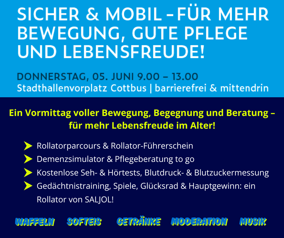 Das Sanitätshaus Zimmermann, der Pflegestützpunkt Cottbus und viele weitere Akteure laden Seniorinnen und Senioren zum Aktionstag „Sicher & Mobil – Für mehr Bewegung, Gute Pflege und Lebensfreude“ ein. Er findet am Donnerstag, 05.06.2025, von 9:00 bis 13:00 Uhr auf dem Stadthallenvorplatz statt. Interessierte erwarten an diesem Vormittag viele hilfreiche Informationen und kleine Erlebnisse rund um die Gesundheit, Mobilität und Lebensfreude.