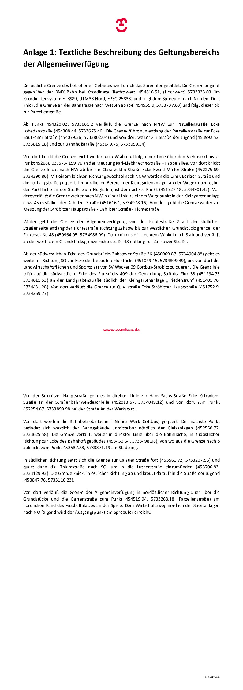H2) Diese Allgemeinverfügung wird auch auf der Webseite der Stadt Cottbus/Chósebuz www.cottbus.de (> Ortsrecht) veröffentlicht. Sie kann auch im Fachbereich Umwelt und Natur der Stadtverwaltung Cottbus/Chóśebuz, Neumarkt 5, 03046 Cottbus nach Terminvereinbarung unter der Telefonnummer 0355 612 2881 oder per Email an umweltamt@cottbus.de eingesehen werden.