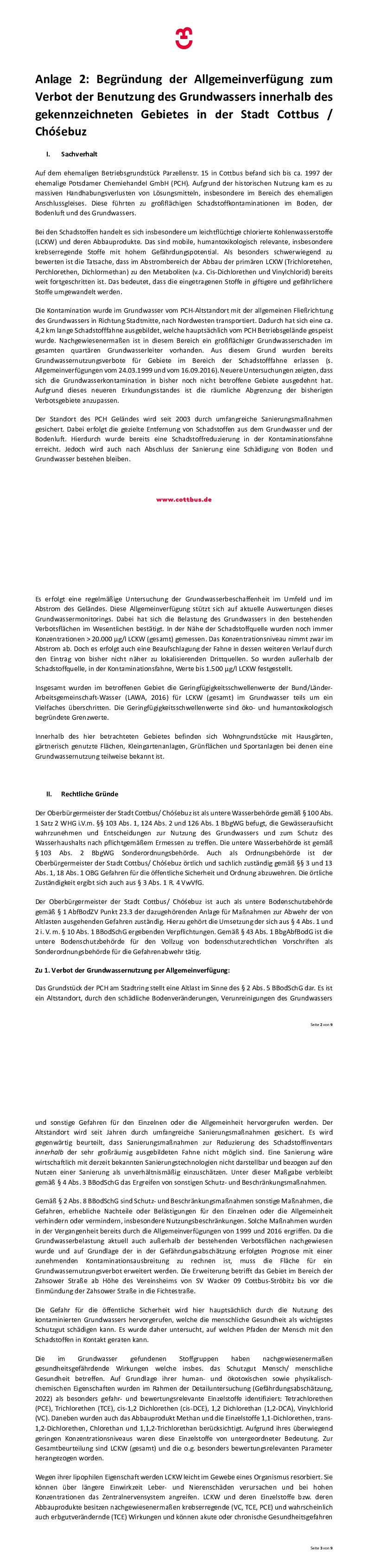 Der Geltungsbereich des Grundwassernutzungsverbotes ist in Anlage 1 verbal beschrieben. Die Allgemeinverfügung gilt örtlich in den in Anlage 3 und 4 dargestellten Grenzen. Die Anlagen sind Bestandteil der Allgemeinverfügung und können auf den in den Hinweisen H1 und H2 genannten Internetseiten eingesehen werden. Der Geltungsbereich kann auch im Geoportal der Stadt Cottbus/Chóśebuz abgerufen werden unter: geoportal.cottbus.de (Auswahl: Geoportal starten > im Themenbaum anklicken: Umwelt und Natur > Wasser > Grundwassernutzungsverbot 2025).