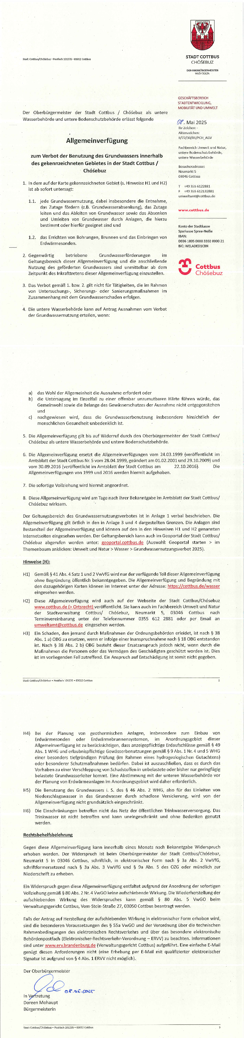 H1) Gemäß § 41 Abs. 4 Satz 1 und 2 VwVfG wird nur der verfügende Teil dieser Allgemeinverfügung ohne Begründung öffentlich bekanntgegeben. Die Allgemeinverfügung und Begründung mit den dazugehörigen Karten können im Internet unter der Adresse: https://dennis.neucottbus.de/wasser eingesehen werden.