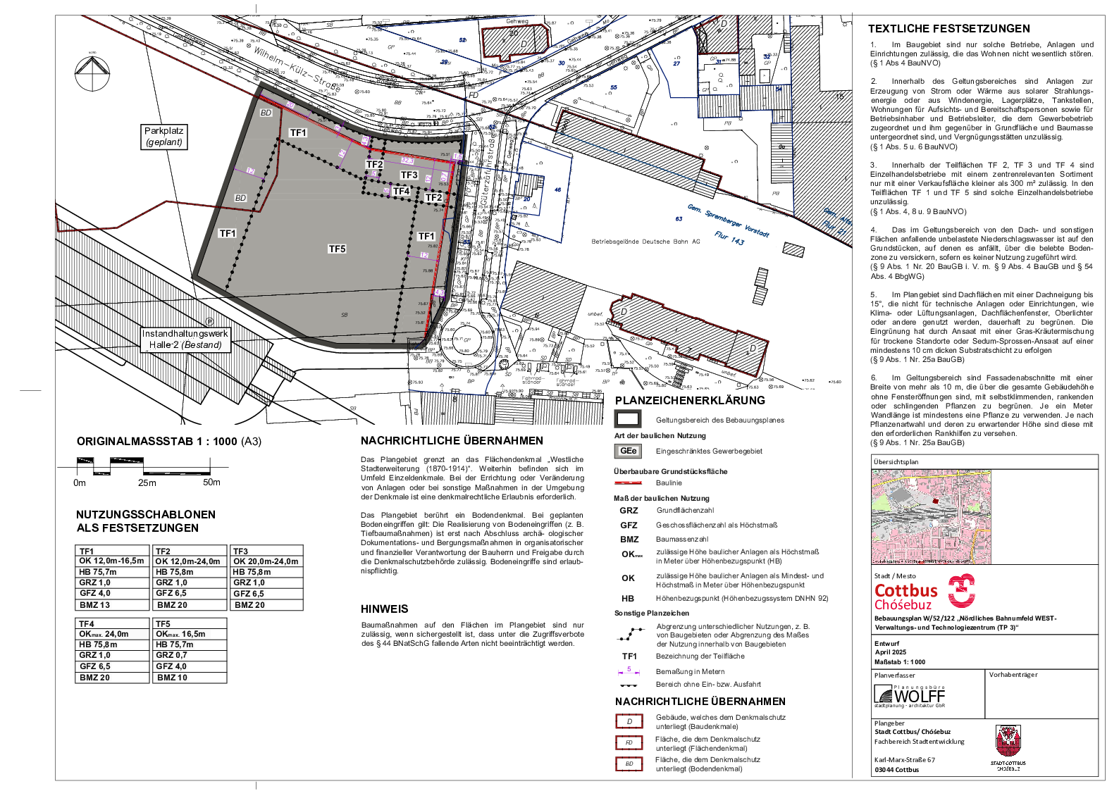 Die Stadtverordnetenversammlung der Stadt Cottbus/Chóśebuz hat in ihrer Sitzung am 28.05.2025 den Entwurf des Bebauungsplanes „Nördliches Bahnumfeld WEST – Verwaltungs- und Technologiezentrum (TP 3)“ einschließlich der zugehörigen Begründung in der Fassung vom April 2025 gebilligt und die Beteiligung der Öffentlichkeit gemäß § 3 Abs. 2 Baugesetzbuch (BauGB) beschlossen.
