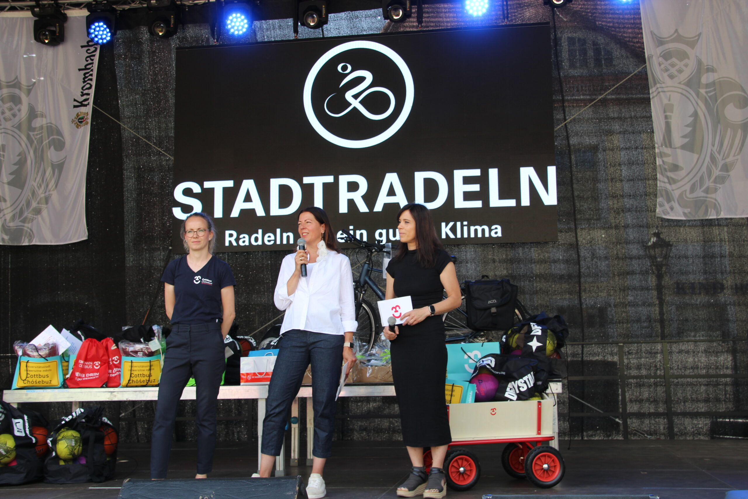 Am Sonntag, 22.06.2025, sind die erfolgreichsten Teams und Radelnde sowie die glücklichen Losgewinner im Rahmen einer feierlichen Preisverleihung auf dem Cottbuser Stadtfest auf der Bühne am Altmarkt von Bürgermeisterin Doreen Mohaupt ausgezeichnet worden.