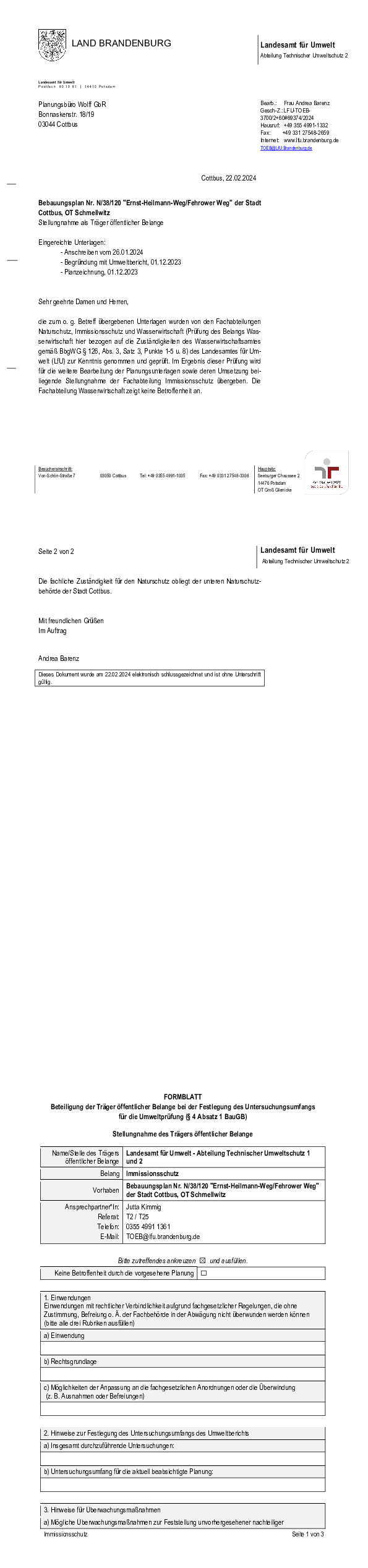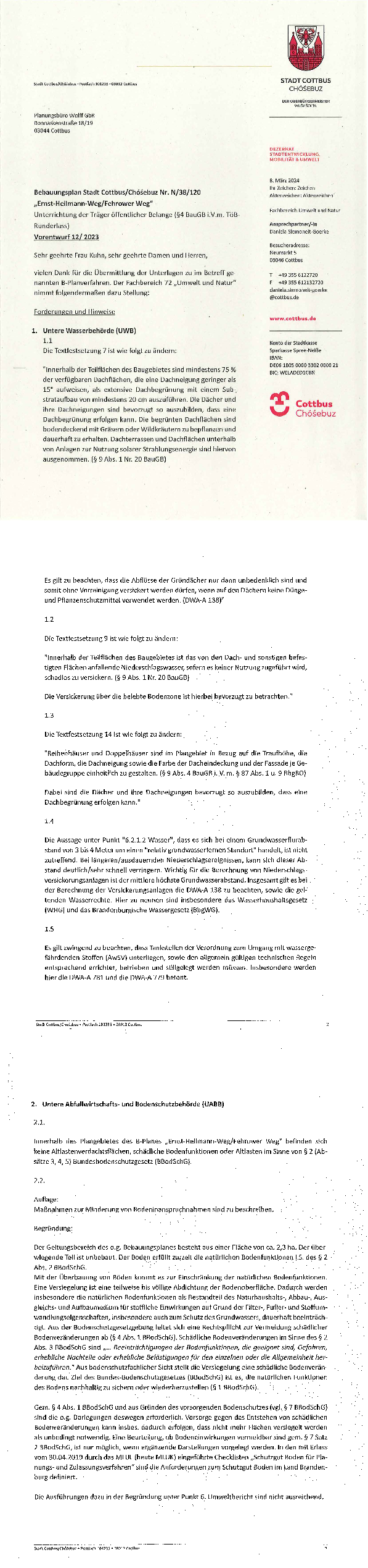 Während dieser Zeit können zu den veröffentlichten Unterlagen Anregungen und Hinweise vorgebracht werden. Entsprechende Stellungnahmen sollen bis spätestens 14.01.2026 elektronisch per E-Mail an bauplanung@cottbus.de übermittelt oder bei Bedarf bis spätestens 16.01.2026 (Posteingang) an den Fachbereich Stadtentwicklung der Stadtverwaltung Cottbus/Chóśebuz, Technisches Rathaus, Karl-Marx-Straße 67, 03044 Cottbus gesendet werden. Alternativ besteht die Möglichkeit, Einlassungen über das Planungsportal des Landes Brandenburg unter https://bb.beteiligung.diplanung.de abzugeben.
