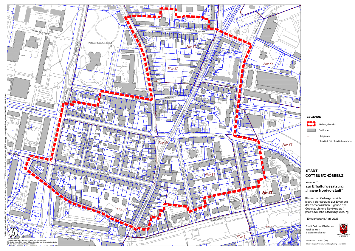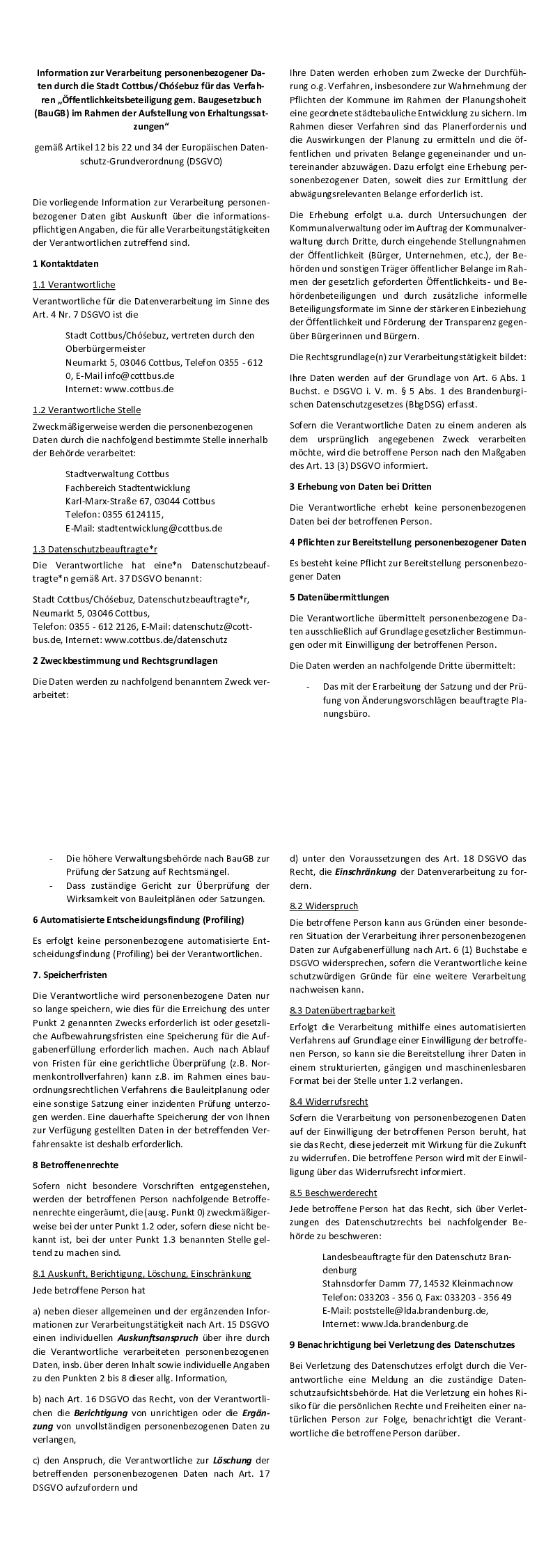 Die Beteiligung der Öffentlichkeit zum Entwurf der Erhaltungssatzung in der Fassung vom 30.04.2025 erfolgt durch die Einstellung der Unterlagen ins Internet im Zeitraum vom 19.05.2025 bis 19.06.2025 auf der Seite cottbus.de/bauplanung.