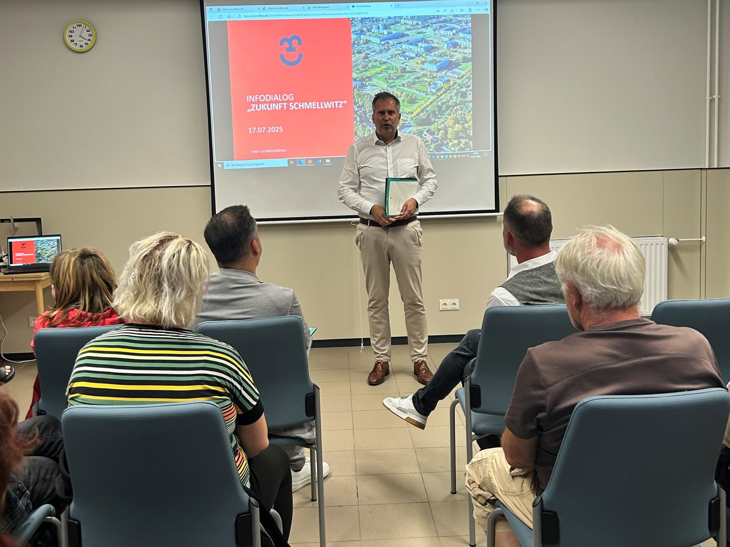 Im Zentrum des Dialogs standen aktuelle und geplante Projekte im Stadtteil und das Stadtteilentwicklungskonzept. Besonderes Interesse galt dem Wohnungsbau und der -sanierung durch die eG Wohnen und die GWC – darunter das Solarquartier Hopfengarten sowie die Entwicklung der Zuschka. Die Rückbauflächen in Schmellwitz sollen künftig neu und nachhaltig genutzt werden, wobei die Stadt auf moderne Wohnkonzepte setzt.