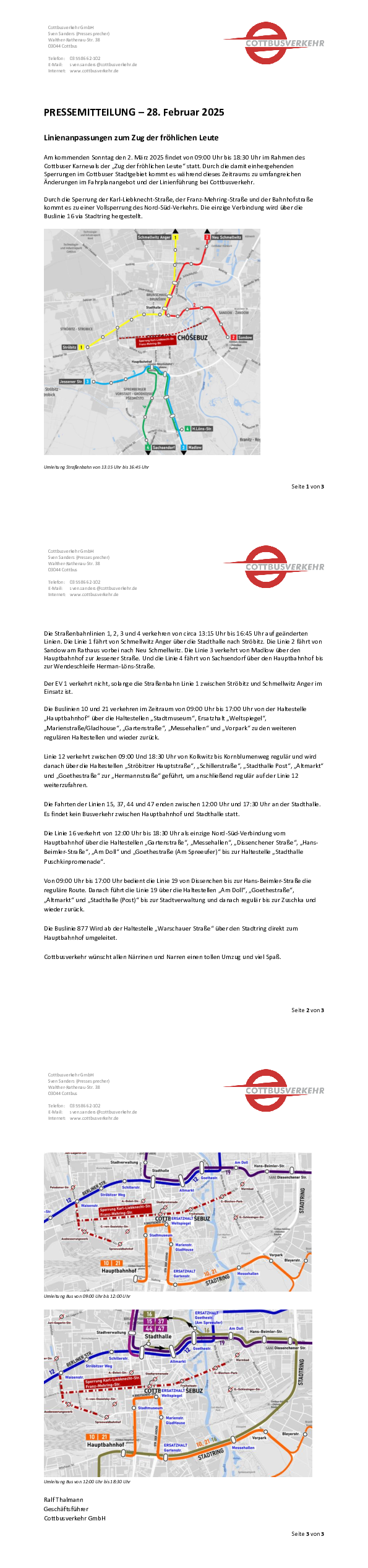 Am kommenden Sonntag den 2. März 2025 findet von 09:00 Uhr bis 18:30 Uhr im Rahmen des Cottbuser Karnevals der „Zug der fröhlichen Leute“ statt. Durch die damit einhergehenden Sperrungen im Cottbuser Stadtgebiet kommt es während dieses Zeitraums zu umfangreichen Änderungen im Fahrplanangebot und der Linienführung bei Cottbusverkehr.