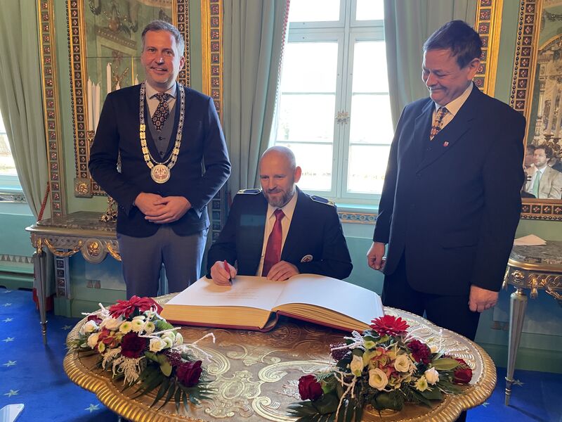 Dr. Ralph Matzky wird geehrt für sein breites ehrenamtliches Engagement in Strukturen des Rettungsdienstes sowie des Gesundheits- und Katastrophenschutzes. Auch ihn würdigte OB Tobias Schick in einer Laudatio. Darin heißt es u.a.: