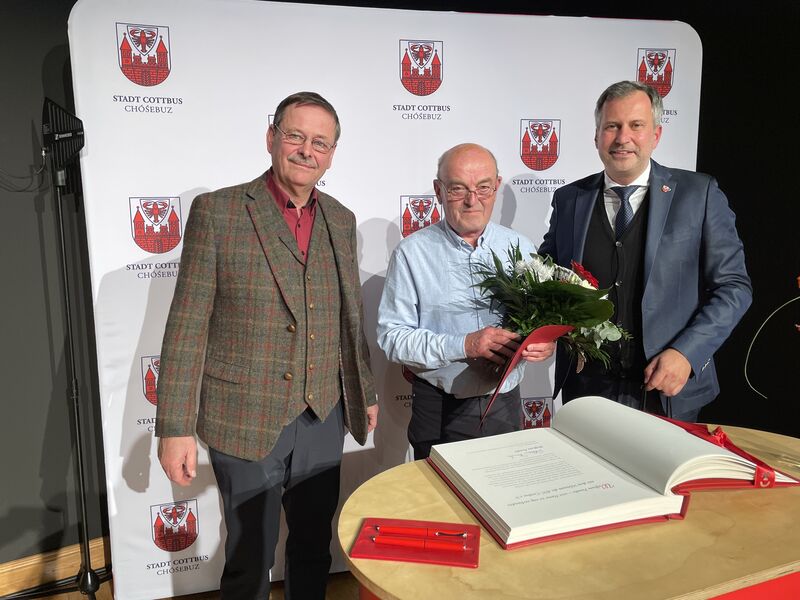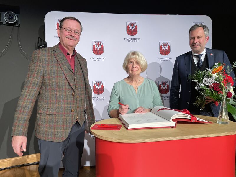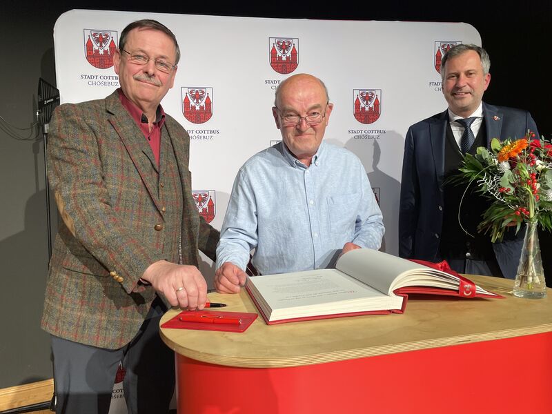 Drei durften sich während der Feier im Saal des Stadthauses in die Ehrenchronik der Stadt Cottbus/Chóśebuz eintragen.