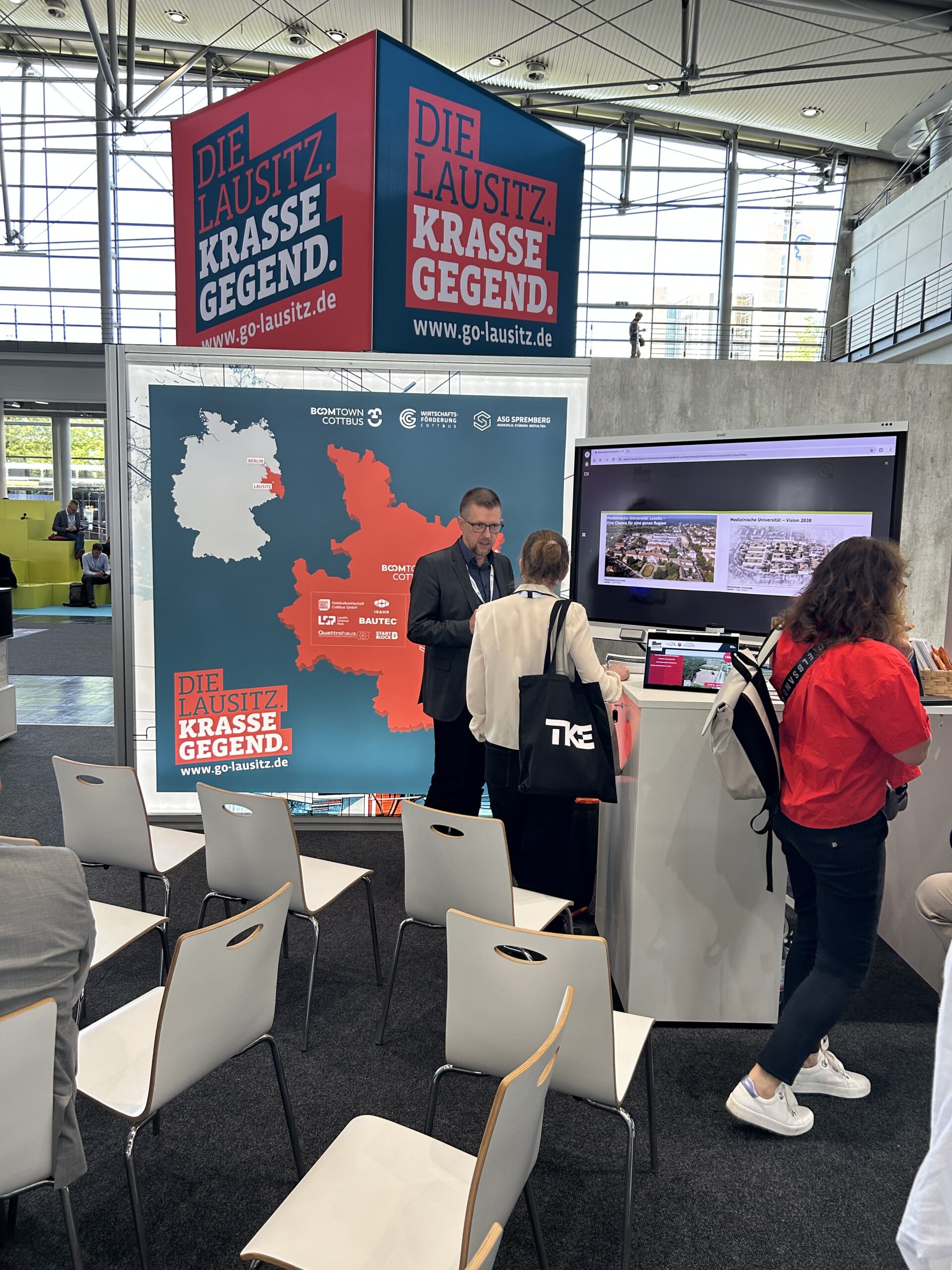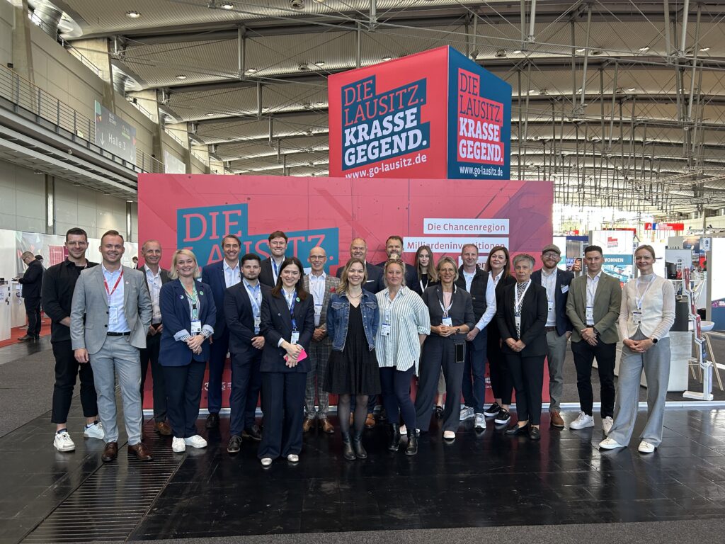 An den beiden Messetagen zog der 88 m² große Gemeinschaftsstand sowohl die Aufmerksamkeit der 400 weiteren Aussteller als auch von tausenden Fachbesuchern auf sich. Zahlreiche Gespräche mit Interessierten, die zum Teil bereits im Vorfeld vereinbart werden konnten, fanden am Stand statt. Allein etwas mehr als 40 Mitglieder der Bundesarchitektenkammer und Architektenkammer Niedersachsen lernten die Lausitz bei einer Kurzpräsentation am Gemeinschaftsstand (neu) kennen. Tim Berndt, Geschäftsführer der EGC Entwicklungsgesellschaft Cottbus mbH, bemerkt zur Umsetzung des Impulses aus der Cottbuser Wirtschaft: „Der Wunsch aus dem Immobiliennetzwerk gab den Anstoß zu einem neuen, kooperativen Format – nicht ohne Hürden haben wir gern den Weg für diesen gemeinsamen Auftritt bereitet.“ Weiterhin erklärt er: „Es kam beim Publikum sehr gut an, dass wir im Team die Lausitz als grenzübergreifende Chancenregion vorgestellt haben. Eine tolle Kooperation, die Spaß gemacht hat und Synergien ermöglichte.“ In direkter Nachbarschaft zur Immobilienmesse fand der Deutsche Städtetag statt. Trotz engem Terminplan konnte OB Tobias Schick der Einladung zur Elefantenrunde auf der Main Stage folgen. Unter der Überschrift „Die Zukunft des Wohnens und des Bauens“ referierten ausgewählte Vertreter um Belit Onay, Oberbürgermeister von Hannover und Axel Gedaschko, Präsident des GdW – Bundesverbandes der deutschen Wohnungs- und Immobilienunternehmen. Konsens war u.a. die Notwendigkeit von Bürokratieabbau sowie beschleunigten Verfahren. Zeitgleich beeindruckte Dr. Markus Niggemann das erlesene Plenum in seiner Projektvorstellung mit dem kooperativen Bestreben der Region, Europas erstes Net Zero Valley werden zu wollen.