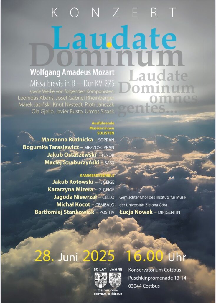 Mit einem Festkonzert „Laudate Dominum“ wird am kommende Sonnabend, 28.06.2025, musikalisch an die nunmehr 50 Jahre bestehende Städtepartnerschaft Cottbus/Chóśebuz – Zielona Góra erinnert. Beginn ist um 16:00 Uhr im Konservatorium in der Puschkinpromenade.