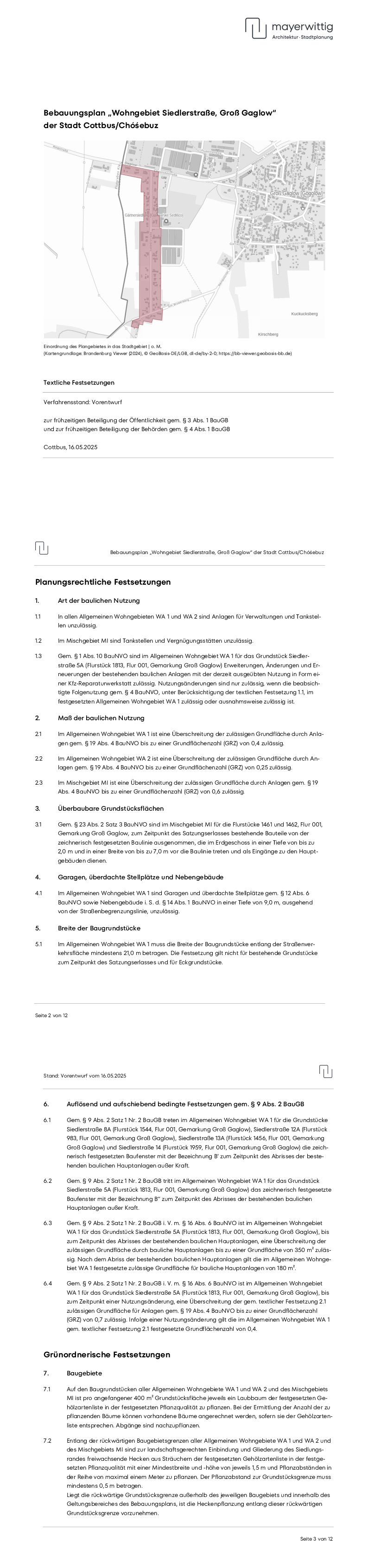 Die Stadtverordnetenversammlung der Stadt Cottbus/Chóśebuz hat am 29.03.2023 in öffentlicher Sitzung gemäß § 1 Abs. 3 Baugesetzbuch (BauGB) die Aufstellung des Bebauungsplanes „Wohngebiet Siedlerstraße, Groß Gaglow“ beschlossen.