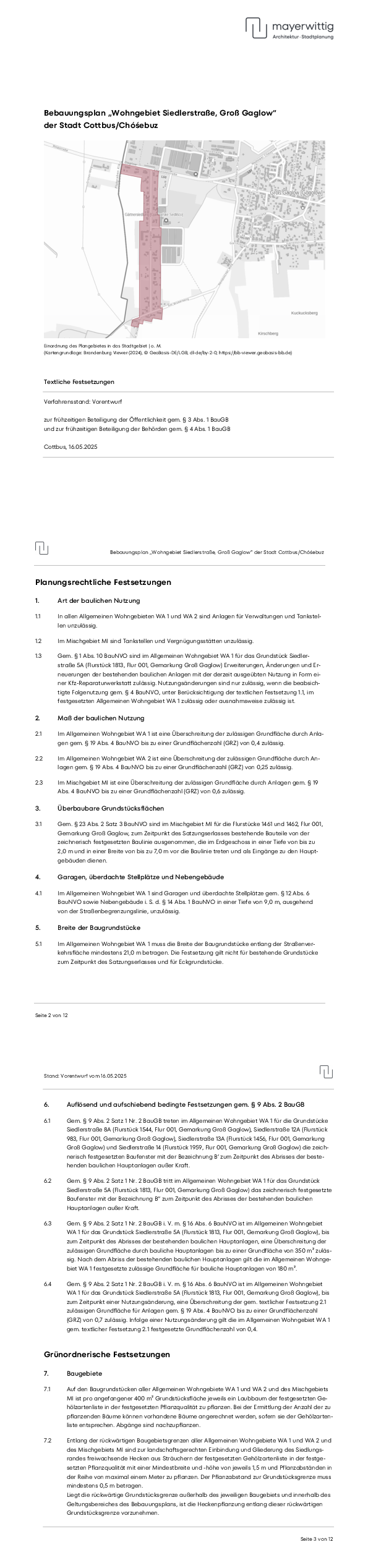 Während dieser Zeit können zu den Unterlagen Stellungnahmen, Anregungen und Hinweise vorgebracht werden. Diese sind spätestens bis zum 16.07.2025 (Posteingang) an den Fachbereich Stadtentwicklung der Stadtverwaltung Cottbus/Chóśebuz, Technisches Rathaus, Karl-Marx-Straße 67 in 03044 Cottbus zu schicken. Ferner besteht die Möglichkeit der Abgabe von Stellungnahmen per E-Mail an die Adresse bauplanung@cottbus.de oder über das Planungsportal des Landes Brandenburg https://bb.beteiligung.diplanung.de.