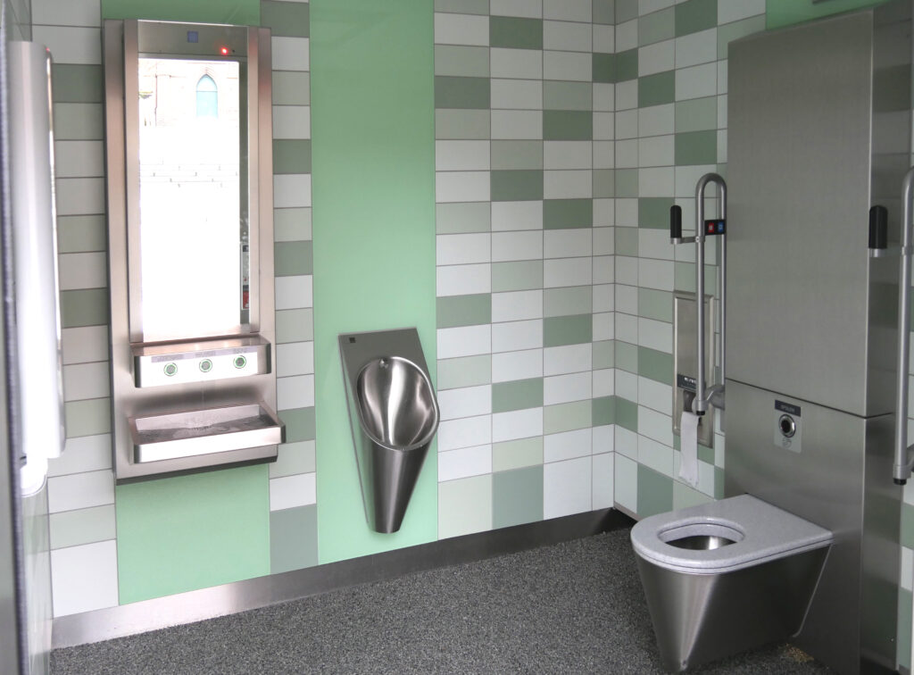 Für Sauberkeit und Hygiene sorgt ein automatisches Bodenreinigungssystem nach jeder Nutzung sowie regelmäßige Reinigung durch Dienstleister. So bleibt die Toilette nicht nur funktional, son-dern auch dauerhaft gepflegt.