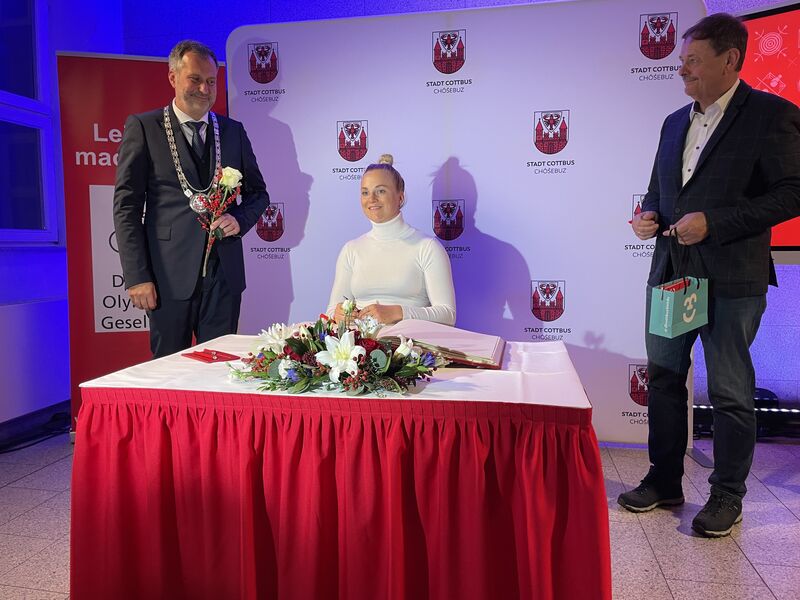 Die olympischen und paralympischen Medaillengewinnerinnen und -gewinner aus Cottbuser Vereinen sind seit Mittwoch, 20.11.2024, erneut mit neuen Plaketten auf dem „Weg des Ruhmes“ in Cottbus/Chóśebuz verewigt. Geehrt wurden damit Para-Schwimmer Josia Topf sowie die Para-Cyclistin Maike Hausberger, die in Paris drei bzw. zwei Medaillen, darunter Gold, holten. Zugleich trugen sich die Radsportlerinnen Lea-Sophie Friedrich, Emma Hinze und Pauline Grabosch, die in Paris Silber und Bronze gewannen, mit den weiteren Teilnehmerinnen und Teilnehmern der Pariser Spiele und den Trainerinnen und Trainern in das Goldene Buch der Stadt Cottbus/Chóśebuz ein.