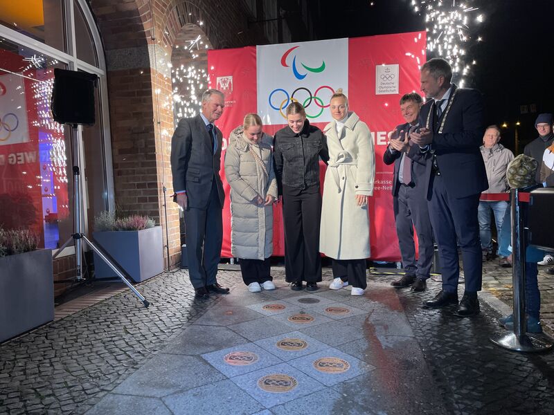 Der „Weg des Ruhmes“ vor dem Rathaus in der Berliner Straße ist von der Deutschen Olympischen Gesellschaft initiiert worden. Insgesamt sind dort jetzt 76 Plaketten für die Medaillengewinnerinnen und -Gewinner bei olympischen und paralympischen Spielen seit 1896 verlegt.