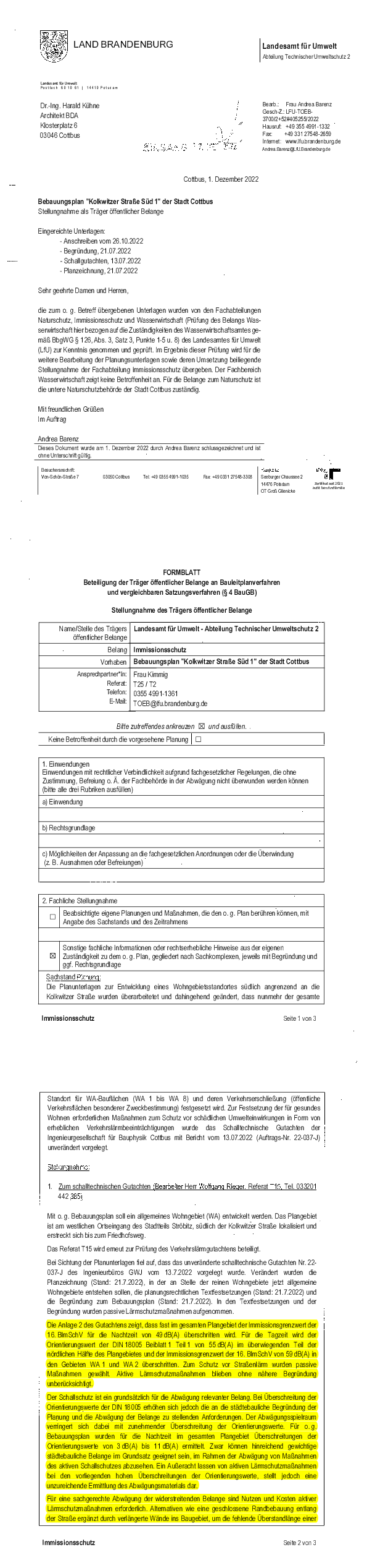 Die Verarbeitung personenbezogener Daten erfolgt auf Grundlage des § 3 BauGB in Verbindung mit Art. 6 Abs. 1 Buchst. e Datenschutz-Grundverordnung (DSGVO) und dem Brandenburgischen Datenschutzgesetz (BbgDSG). Sofern Sie Ihre Stellungnahme ohne Absender abgeben, erhalten Sie keine Mitteilung über das Ergebnis der Abwägung.