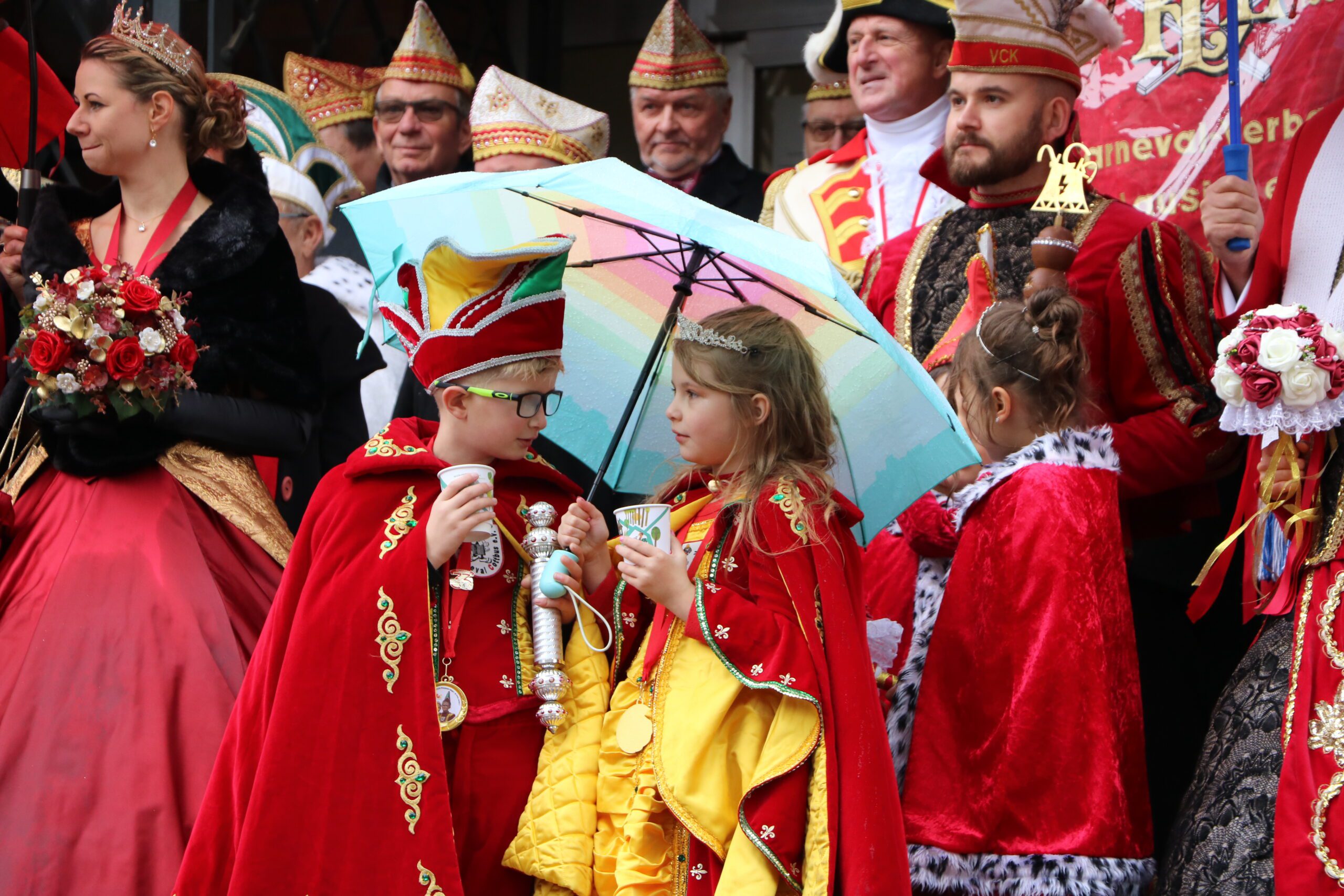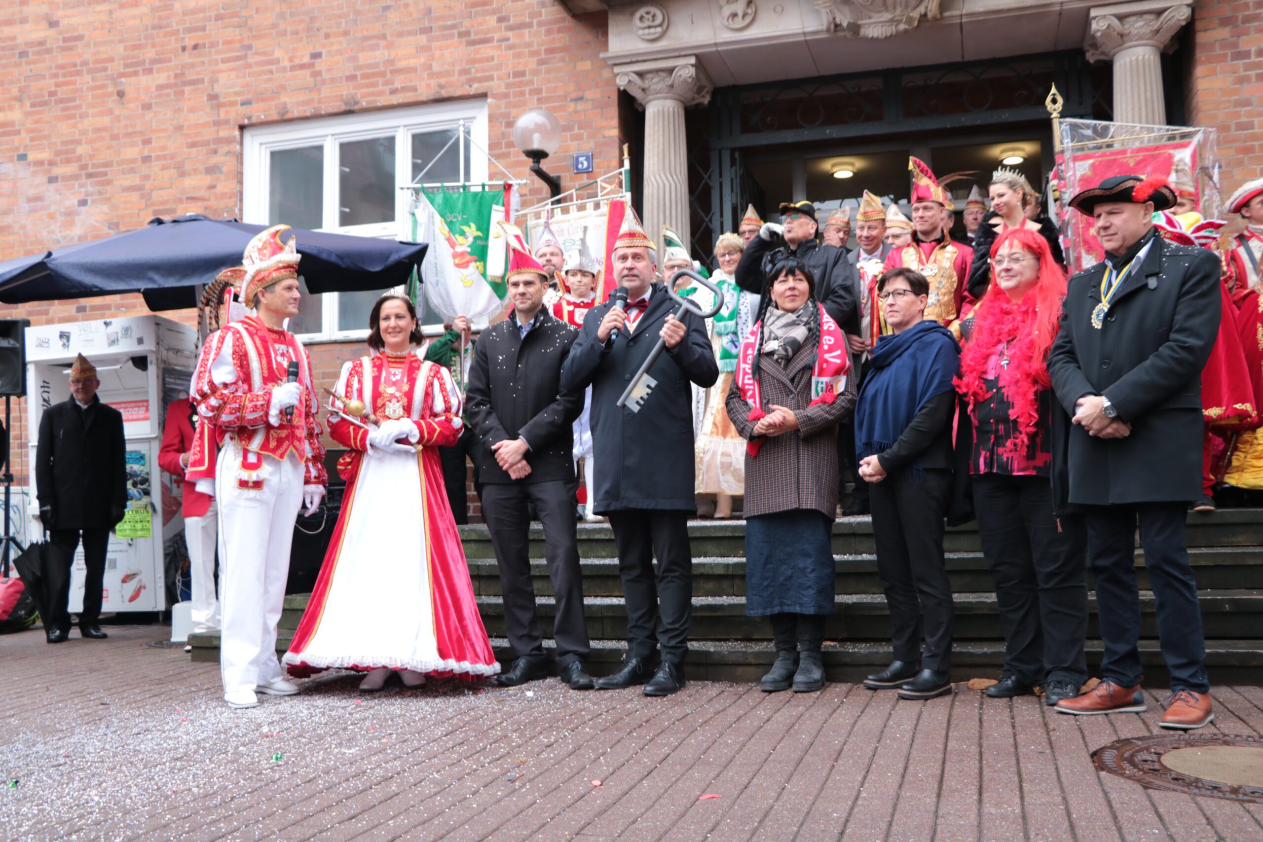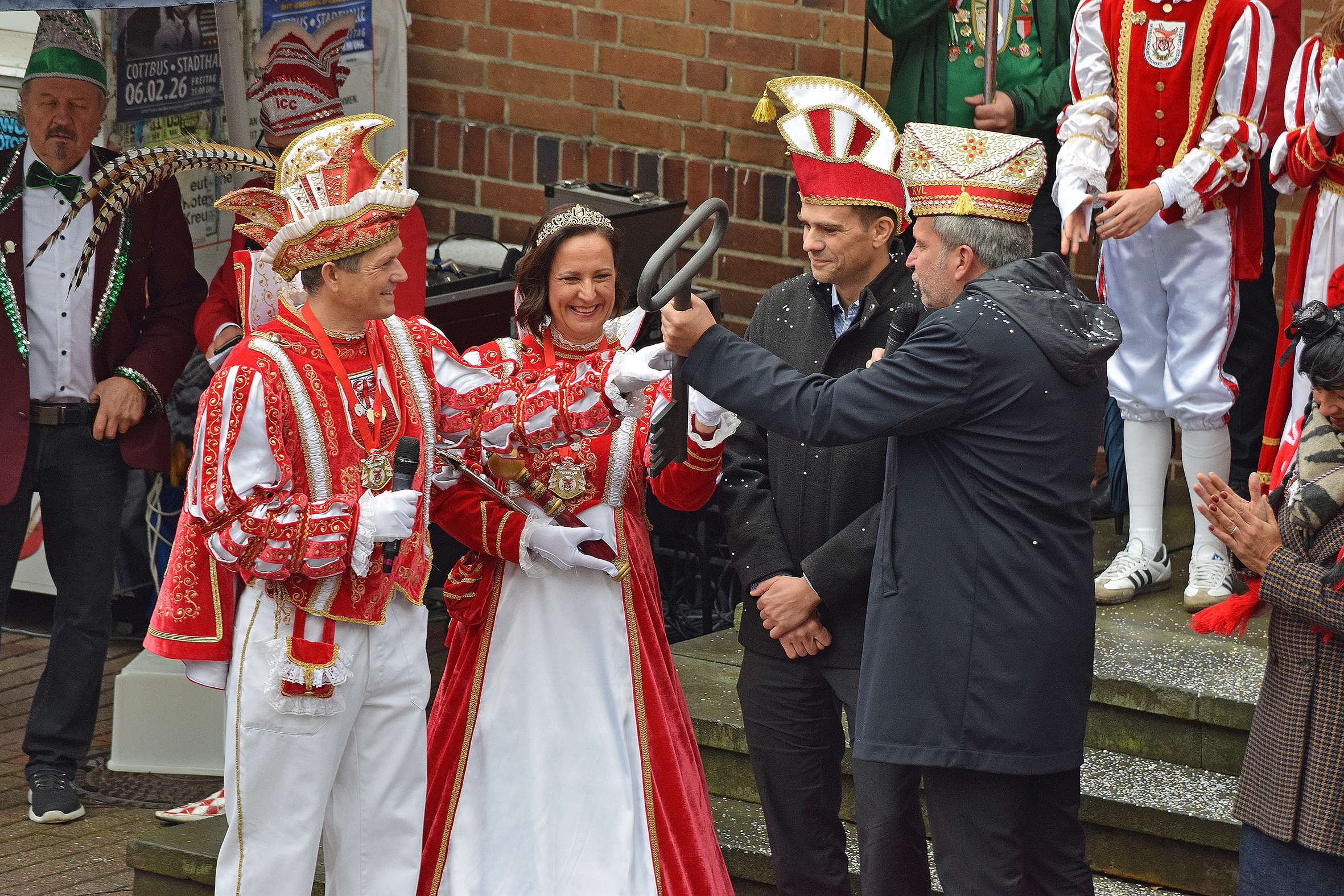 Machtwechsel in Cottbus/Chóśebuz: Das Stadtprinzenpaar Sebastian I und Sonnika I von der Interessengemeinschaft Cottbuser Carneval (ICC) hat am Dienstag, 11.11, pünktlich um 11:11 Uhr den Rathausschlüssel von Oberbürgermeister Tobias Schick übernommen. Mehrere hundert Beteiligte und Schaulustige ließen sich auch von zeitweisem Regen nicht schrecken, sie sangen, tanzten, feierten nach dem traditionellen Kanonenschuss um 11:11 Uhr. Beteiligt waren insgesamt sechs Karnevalsvereine bzw. -verbände.