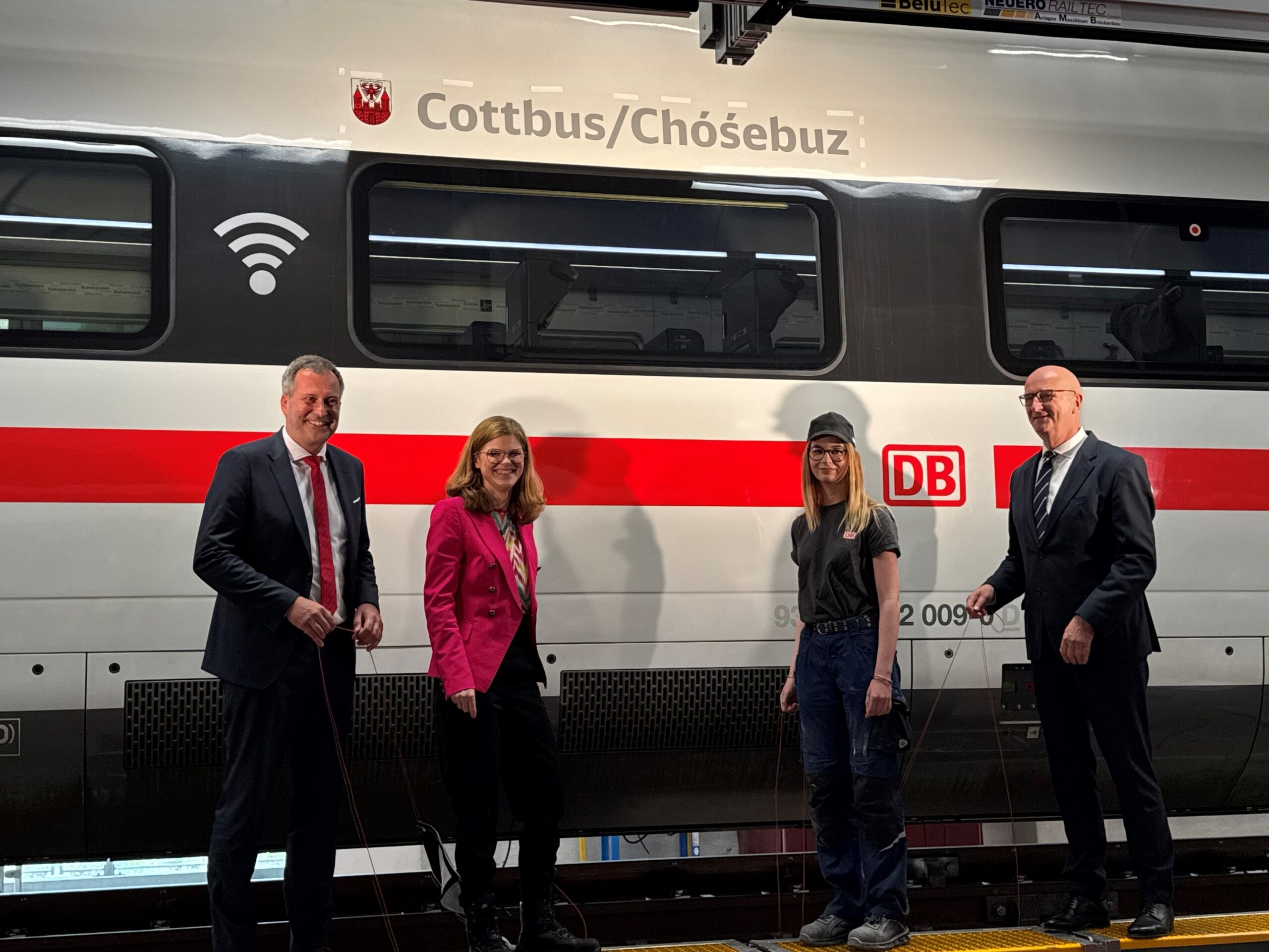 Regionaltypisch mit Spreewälder Gurkenwasser wurde der ICE-Triebzug 9009 im neuen Werk der DB in Cottbus/Chóśebuz getauft. Brandenburgs Ministerpräsident Dr. Dietmar Woidke, der Cottbuser Oberbürgermeister Tobias Schick, Dr. Daniela Gerd tom Markotten, DB-Vorständin für Digitalisierung und Technik, und Angelina Tantow, Fahrzeuglackiererin in Ausbildung im neuen Werk Cottbus, enthüllten gemeinsam das Stadtwappen und Schriftzug „Cottbus / Chóśebuz“. Diese sind jetzt rechts und links an beiden Spitzen des rund 350 Meter langen ICE zu sehen.