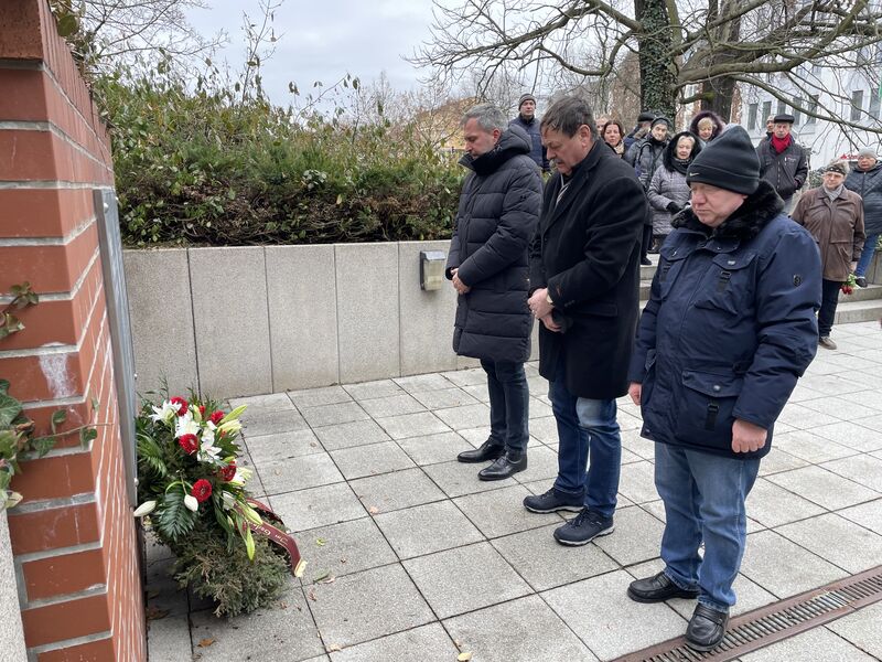 Stilles Erinnern am Holocaust-Gedenktag: In Cottbus/Chóśebuz haben Oberbürgermeister Tobias Schick und der Vorsitzende der Stadtverordnetenversammlung, Dr. Wolfgang Bialas, einen Kranz an der Gedenktafel am Standort der alten Synagoge niedergelegt.