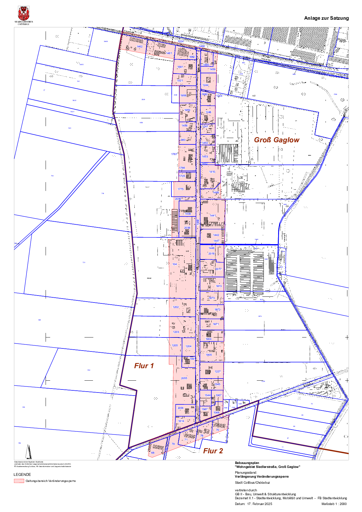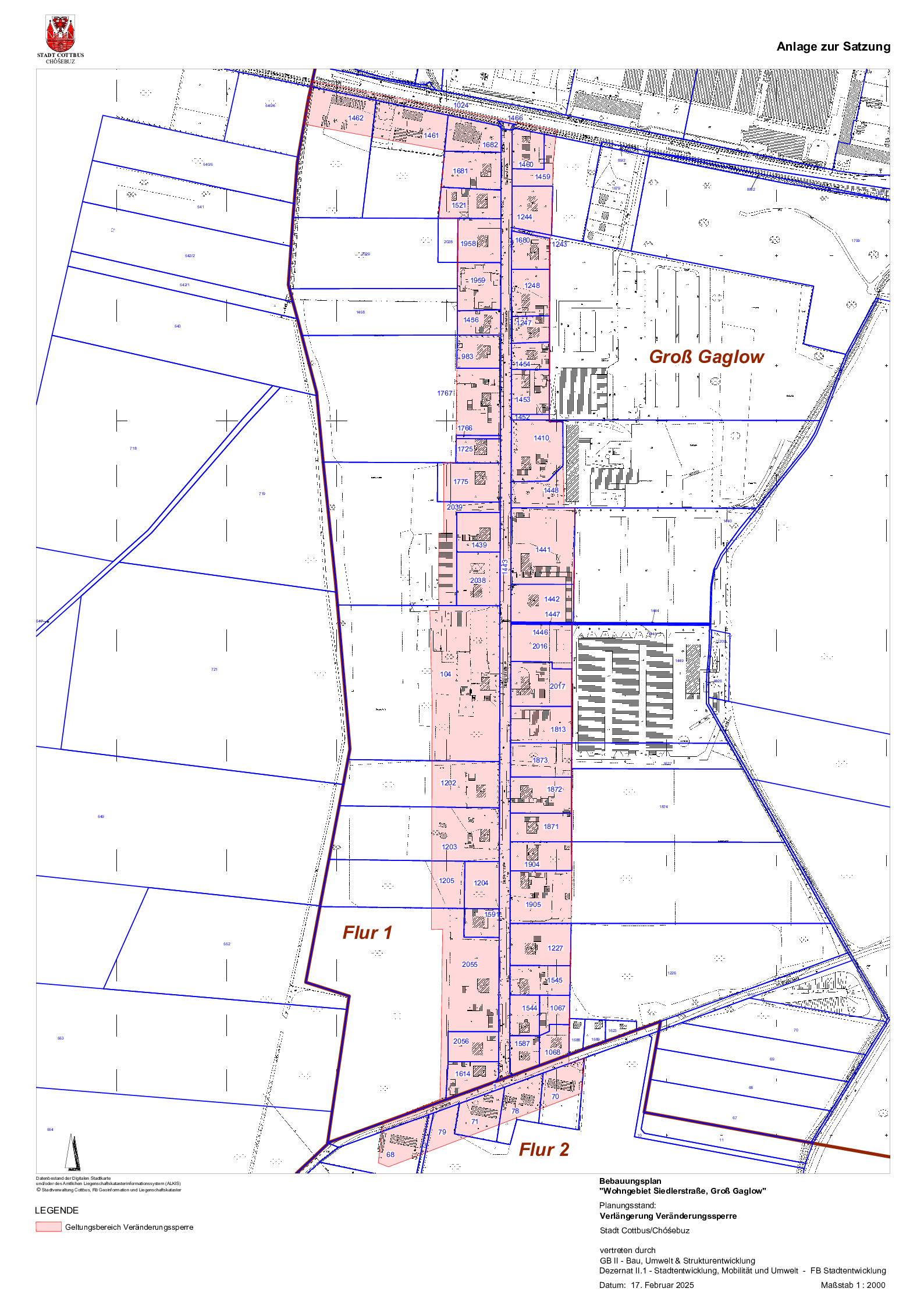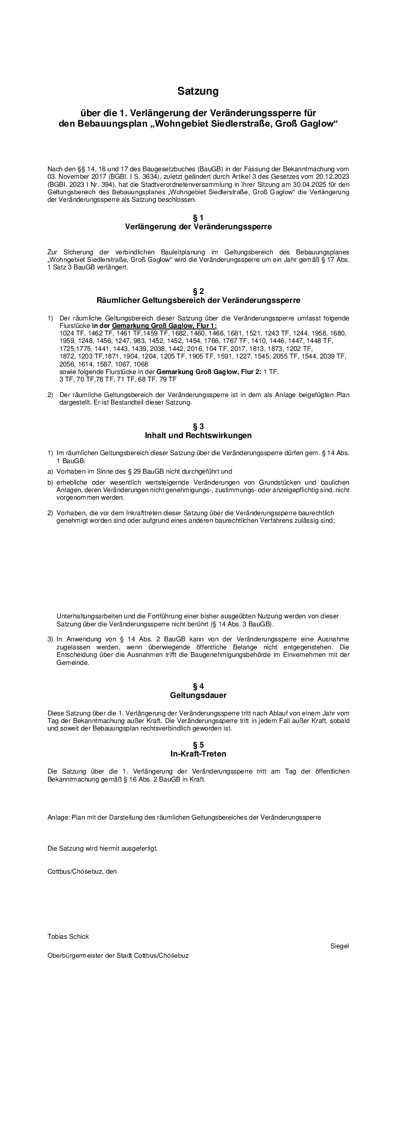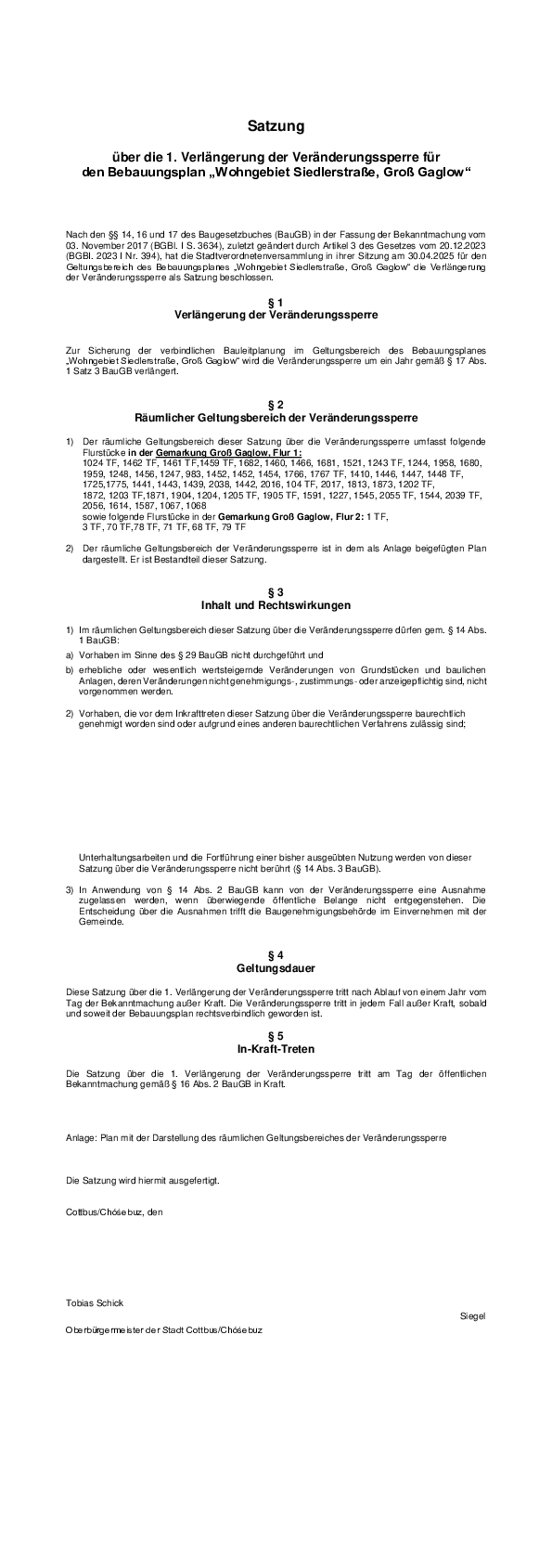 Zur Sicherung der verbindlichen Bauleitplanung im Geltungsbereich des Bebauungsplanes „Wohngebiet Siedlerstraße, Groß Gaglow“ hat die Stadtverordnetenversammlung der Stadt Cottbus/Chóśebuz in ihrer Sitzung am 30.04.2025 auf Grundlage von § 17 Abs. 1 Satz 3 BauGB die Verlängerung der Veränderungssperre um ein Jahr beschlossen.