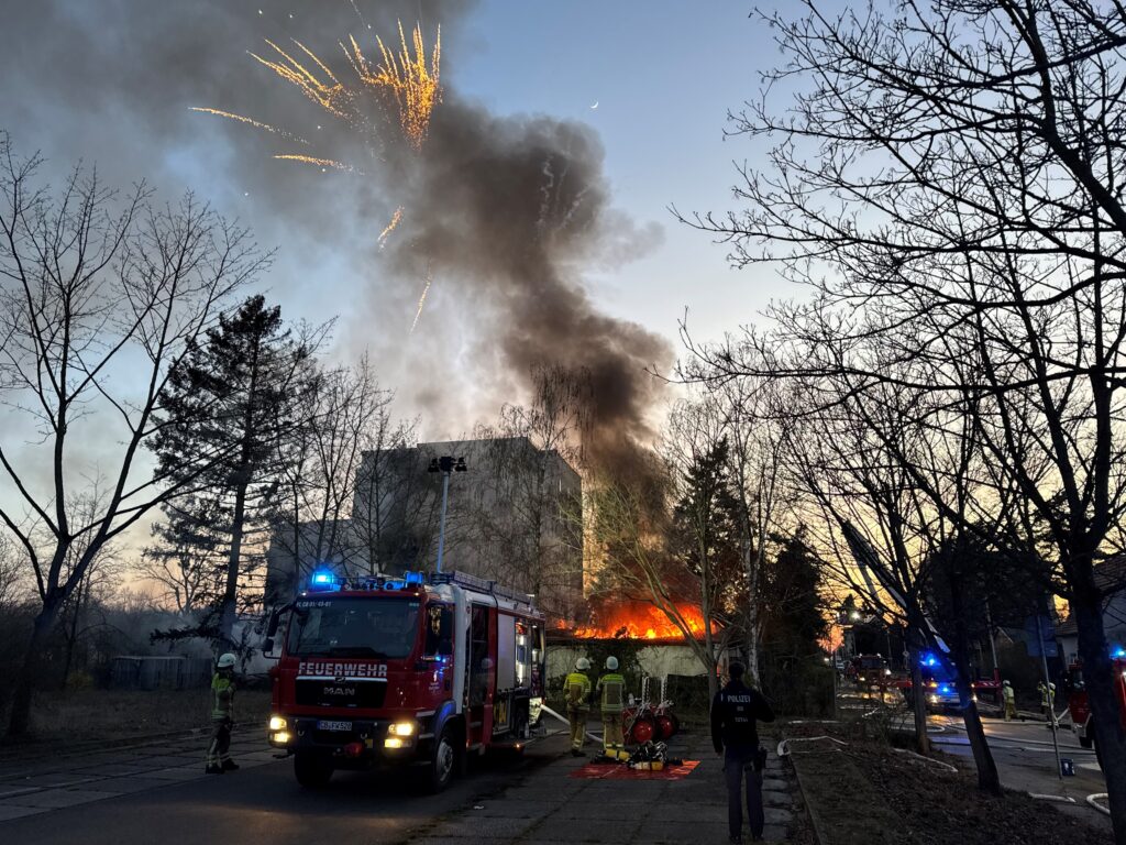 Bei einem Hausbrand in Sachsendorf ist nach ersten Erkenntnissen eine Person verletzt und in ein Krankenhaus gebracht worden. Der Brand in der Hegelstraße war gegen 17:30 Uhr gemeldet worden. Während der Löscharbeiten, die bis in den späten Abend andauerten, hat es mehrere kleinere Explosionen von Gasflaschen gegeben. Zwischenzeitlich explodierten zudem offenbar ebenfalls im Haus gelagerte Feuerwerksraketen und boten ein bizarres Schauspiel.