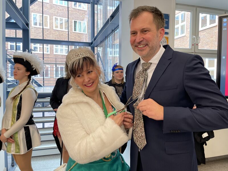 Der Verein Cottbuser Narrenweiber hat am Donnerstag, 27.02.2025, den Weiberfastnachtsumzug im Foyer des Rathauses am Neumarkt 5 gestartet. Den männlichen Vertretern der Rathausspitze wurden dabei traditionell die Krawatten abgeschnitten. Angefangen bei Oberbürgermeister Tobias Schick, folgten Beigeordneter Robert Perko und Dezernent Thomas Bergner sowie weitere Rathaus-Mitarbeiter.