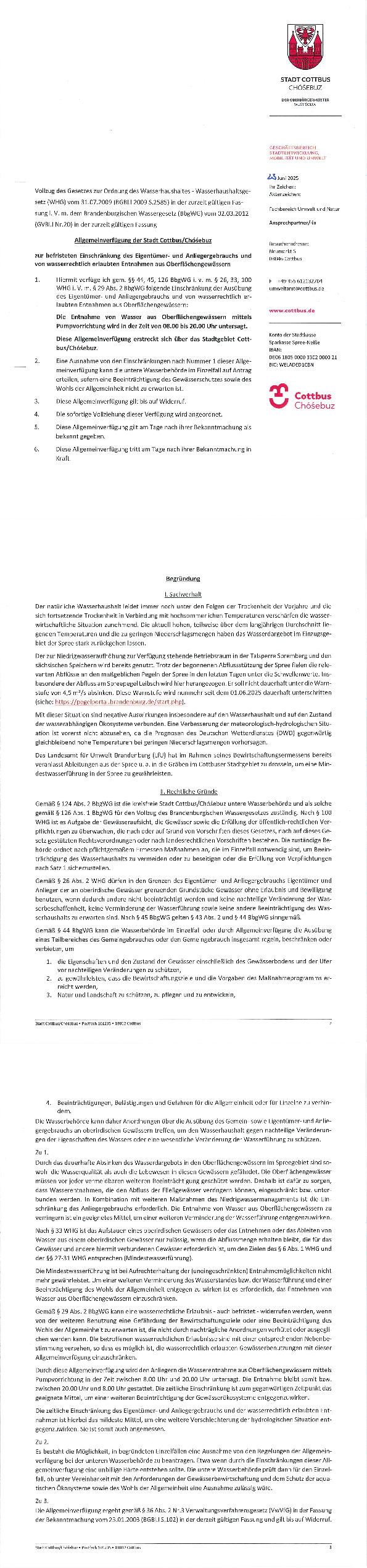 Die Allgemeinverfügung der Stadt Cottbus/Chóśebuz vom 23.06.2025 zur befristeten Einschränkung des Eigentümer- und Anliegergebrauchs und von wasserrechtlich erlaubten Entnahmen aus Oberflächengewässern, veröffentlicht auf https://cottbus.de/niedrigwasser wird widerrufen.