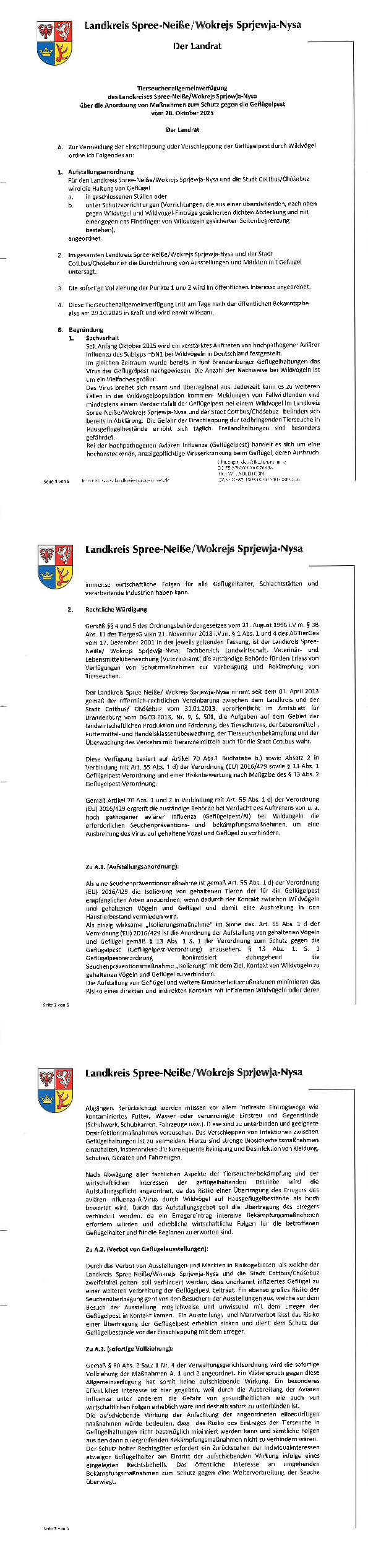 Mit Wirkung zum 29. Oktober 2025 tritt für den Landkreis Spree-Neiße/Wokrejs Sprjewja-Nysa und die Stadt Cottbus/Chóśebuz eine Tierseuchenallgemeinverfügung über die Anordnung von Maßnahmen zum Schutz gegen die Geflügelpest in Kraft.