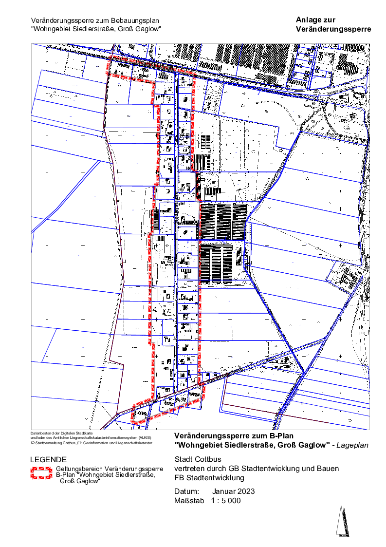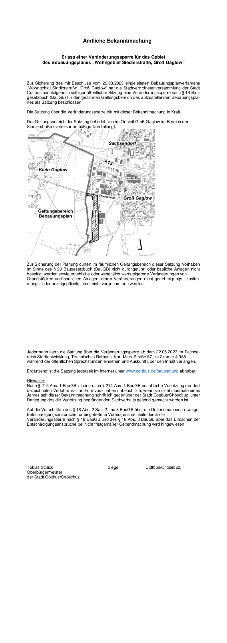 Zur Sicherung des mit Beschluss vom 29.03.2023 eingeleiteten Bebauungsplanverfahrens „Wohngebiet Siedlerstraße, Groß Gaglow“ hat die Stadtverordnetenversammlung der Stadt Cottbus nachfolgend in selbiger öffentlicher Sitzung eine Veränderungssperre nach § 14 Baugesetzbuch (BauGB) für den gesamten Geltungsbereich des aufzustellenden Bebauungsplanes als Satzung beschlossen.