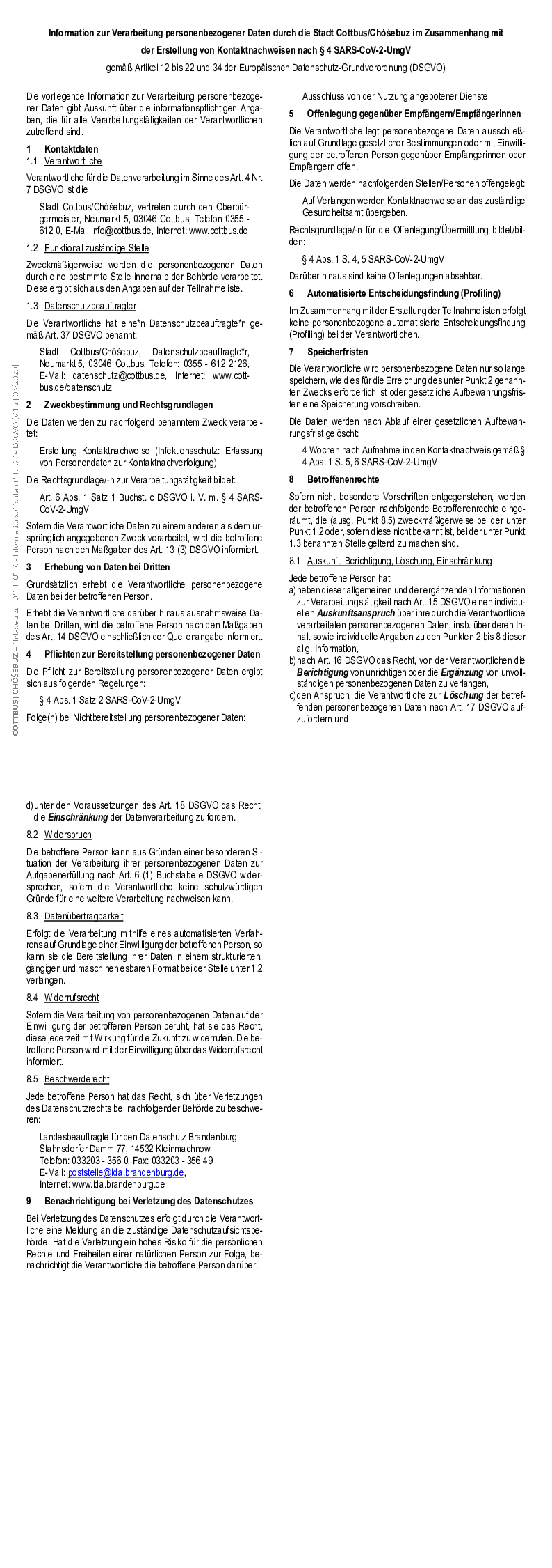 Information zur Verarbeitung personenbezogener Daten durch die Stadt Cottbus/Chóśebuz in Zusammenhang mit der