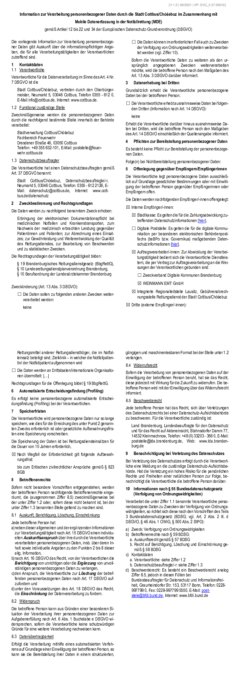 Information zur Verarbeitung personenbezogener Daten durch die Stadt Cottbus/Chóśebuz im Zusammenhang mit Mobile Datenerfassung in der Notfallrettung (MDE)