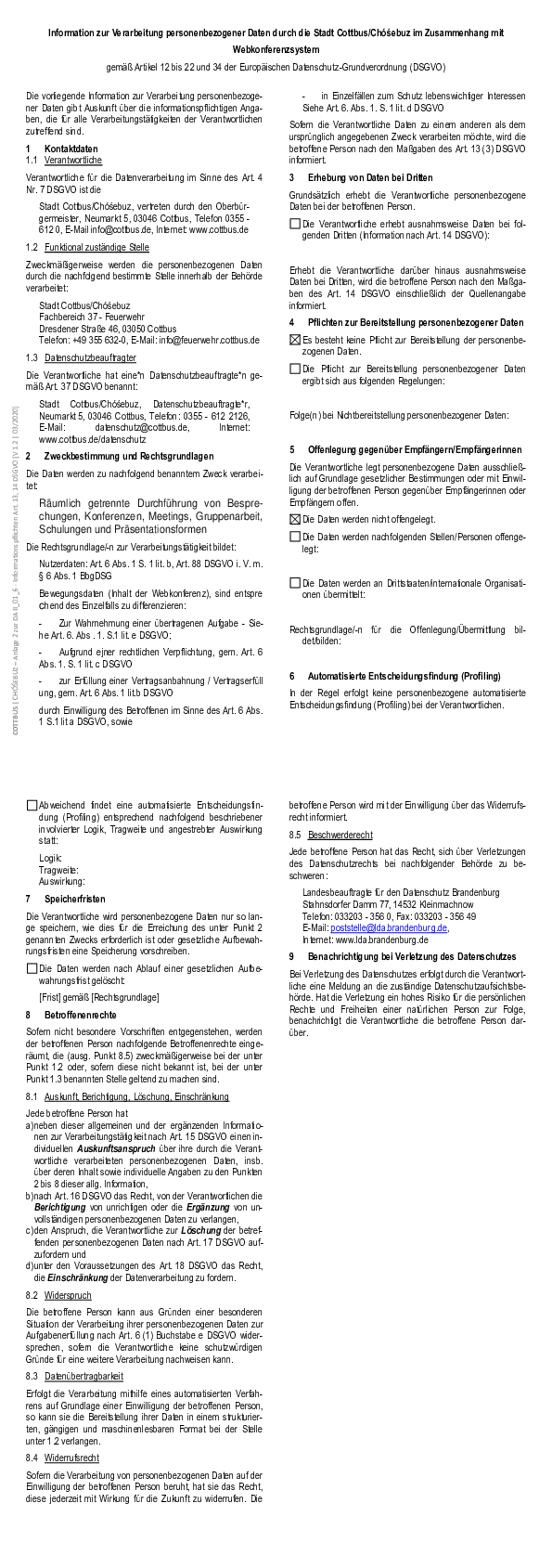 Information zur Verarbeitung personenbezogener Daten durch die Stadt Cottbus/Chóśebuz im Zusammenhang mit