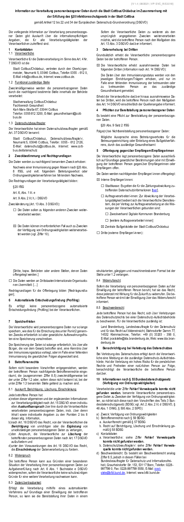 Information zur Verarbeitung personenbezogener Daten durch die Stadt Cottbus/Chóśebuz im Zusammenhang mit der Erfüllung des §20 Infektionsschutzgesetz in der Stadt Cottbus