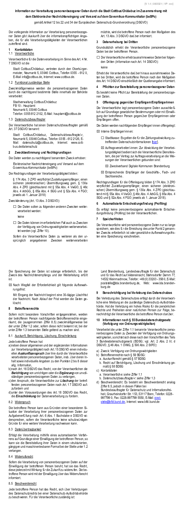 Information zur Verarbeitung personenbezogener Daten durch die Stadt Cottbus/Chóśebuz im Zusammenhang mit dem Elektronischer Nachrichteneingang und Versand auf dem Governikus-Kommunikator (beBPo) gemäß Artikel 12 bis 22 und 34 der Europäischen Datenschutz-Grundverordnung (DSGVO)