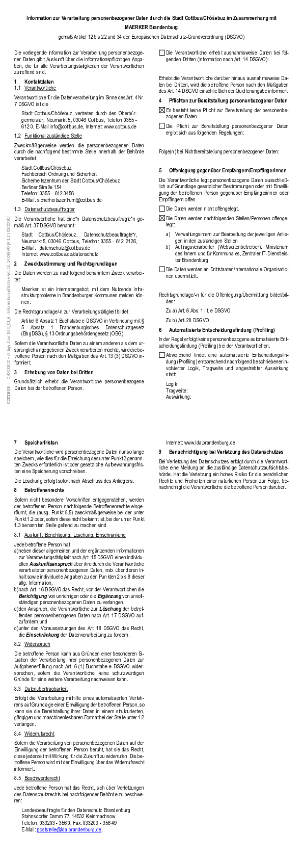 Information zur Verarbeitung personenbezogener Daten durch die Stadt Cottbus/Chóśebuz im Zusammenhang mit