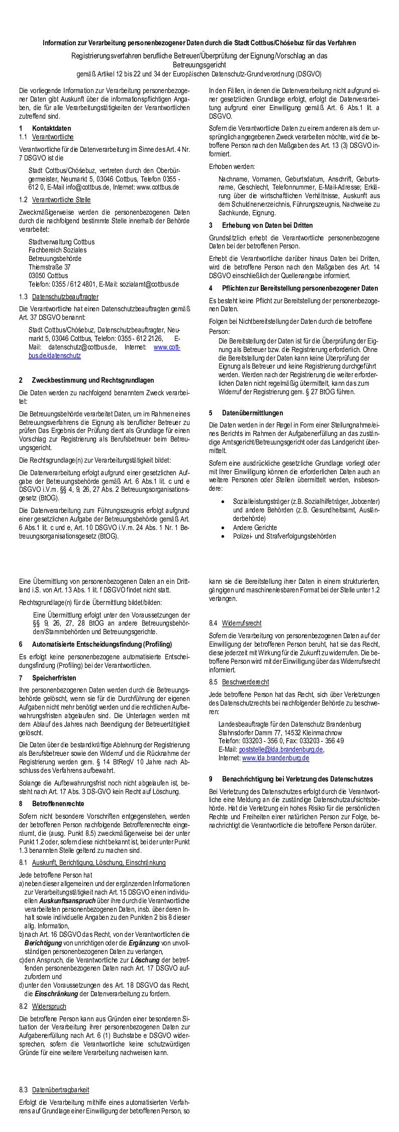 Information zur Verarbeitung personenbezogener Daten durch die Stadt Cottbus/Chóśebuz für das Verfahren