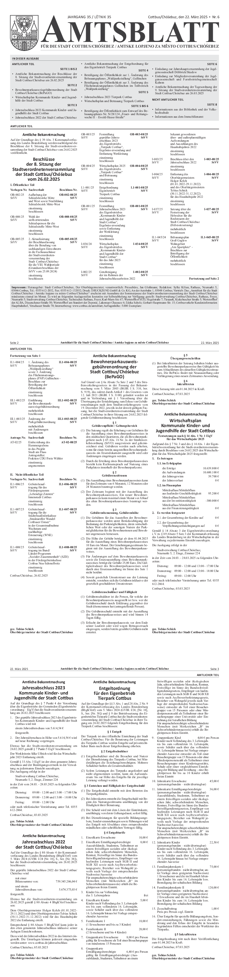 - Amtliche Bekanntmachung der Beschlüsse der 8. Sitzung der Stadtverordnetenversammlung der Stadt Cottbus/Chóśebuz am 26.02.2025