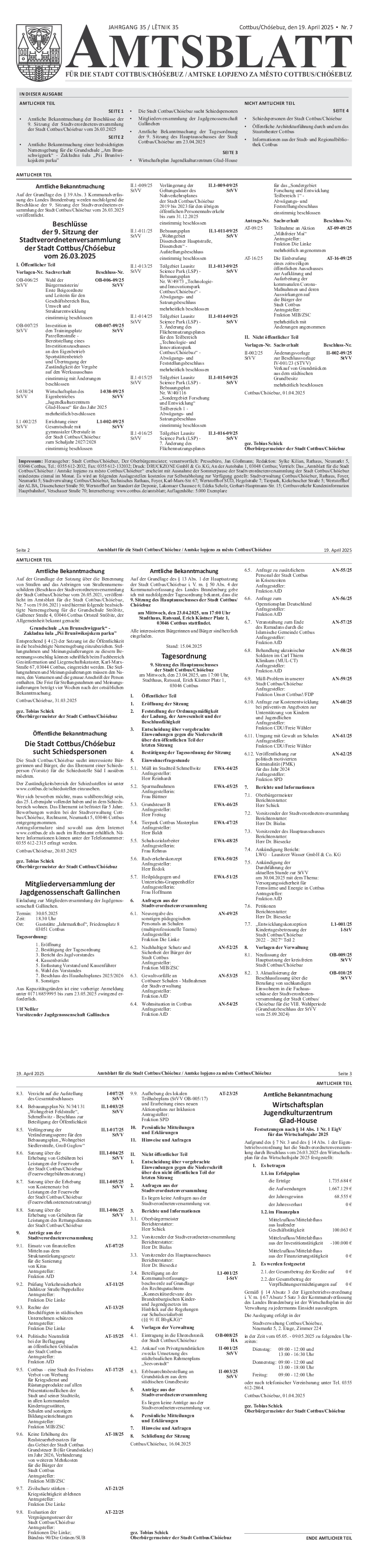 • Amtliche Bekanntmachung der Tagesordnung der 9. Sitzung des Hauptausschusses der Stadt Cottbus/Chóśebuz am 23.04.2025