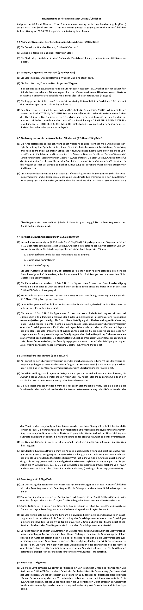 Hauptsatzung der kreisfreien Stadt Cottbus-Chóśebuz vom 17.05.2025