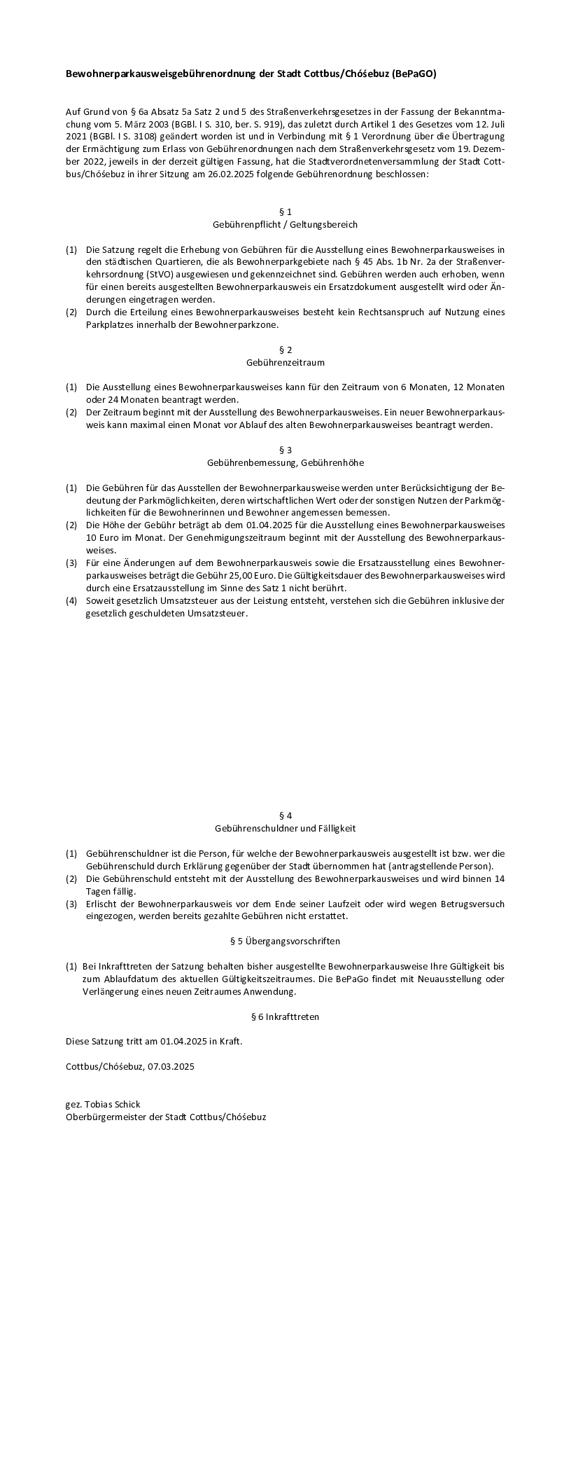 Bewohnerparkausweisgebührenordnung der Stadt Cottbus/Chóśebuz (BePaGO) - Stadt Cottbus/Chóśebuz